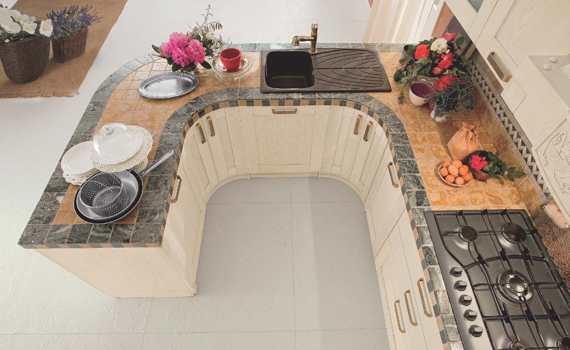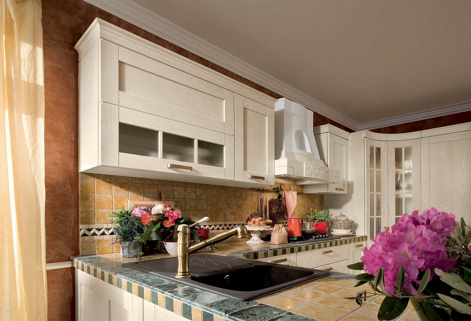Kitchen Signoressa Classica comp.3 from the Italian manufacturer Ar-Tre. The structure of the kitchen made of waterproof wood. Fronts made of solid wood finish in "Decape" white tone, glass stained doors with frosted glass, handles made of bronze. Countertop tiled with ceramic tiles with contrasting decorative inserts. Colors to choose from manufacturer's catalogue. Built-in appliances. This model has an original curved design, provides Peninsula. An innovative approach to the layout of the kitchen space based on tradition and functionality. Classical style of singing.