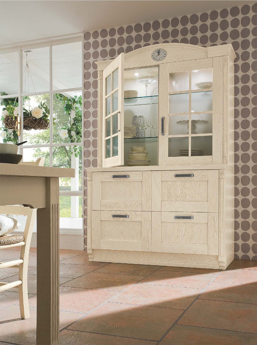Kitchen Signoressa Classica comp.4 from the Italian manufacturer Ar-Tre. The structure of the kitchen made of waterproof wood. Fronts made of solid wood finish in "Decape" white tone, glass stained doors with frosted glass, handle out of metal. Countertop made of artificial stone marble. Colors to choose from manufacturer's catalogue. Built-in appliances. This model combines traditional style and functional decisions of the organization of internal space. Classical style of singing.