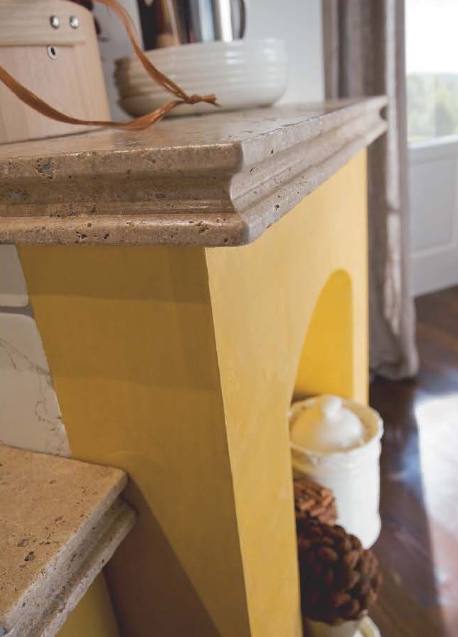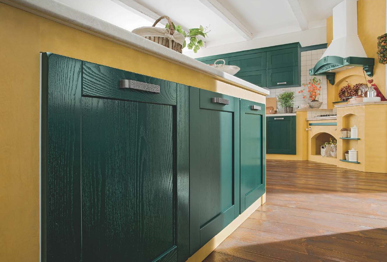 Kitchen Signoressa Classica comp.5 from the Italian manufacturer Ar-Tre. Frame kitchen is made of waterproof wood. The facades of ash in green lacquered finish with open pores, stained glass doors with frosted glass, handle metal. The table-top working area and the bar counter made of artificial stone, the cooking zone in the form of a furnace lined with ceramic tiles. Colors to choose from manufacturer's catalogue. Built-in appliances. Kitchen space divided into zones: a place for cooking, sink, pantry and dining area. Noteworthy carved niche hood and in the kiln, decorated in warm colors and natural stone. Aesthetic solution for your kitchen in a classic style with a rustic aesthetic.