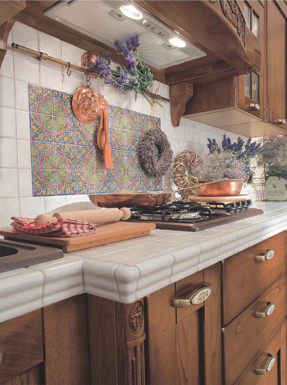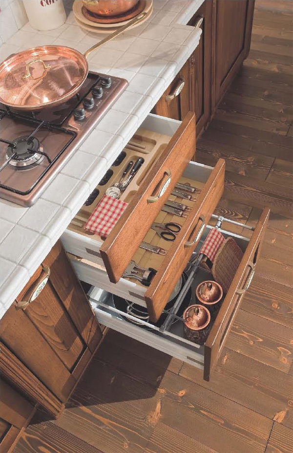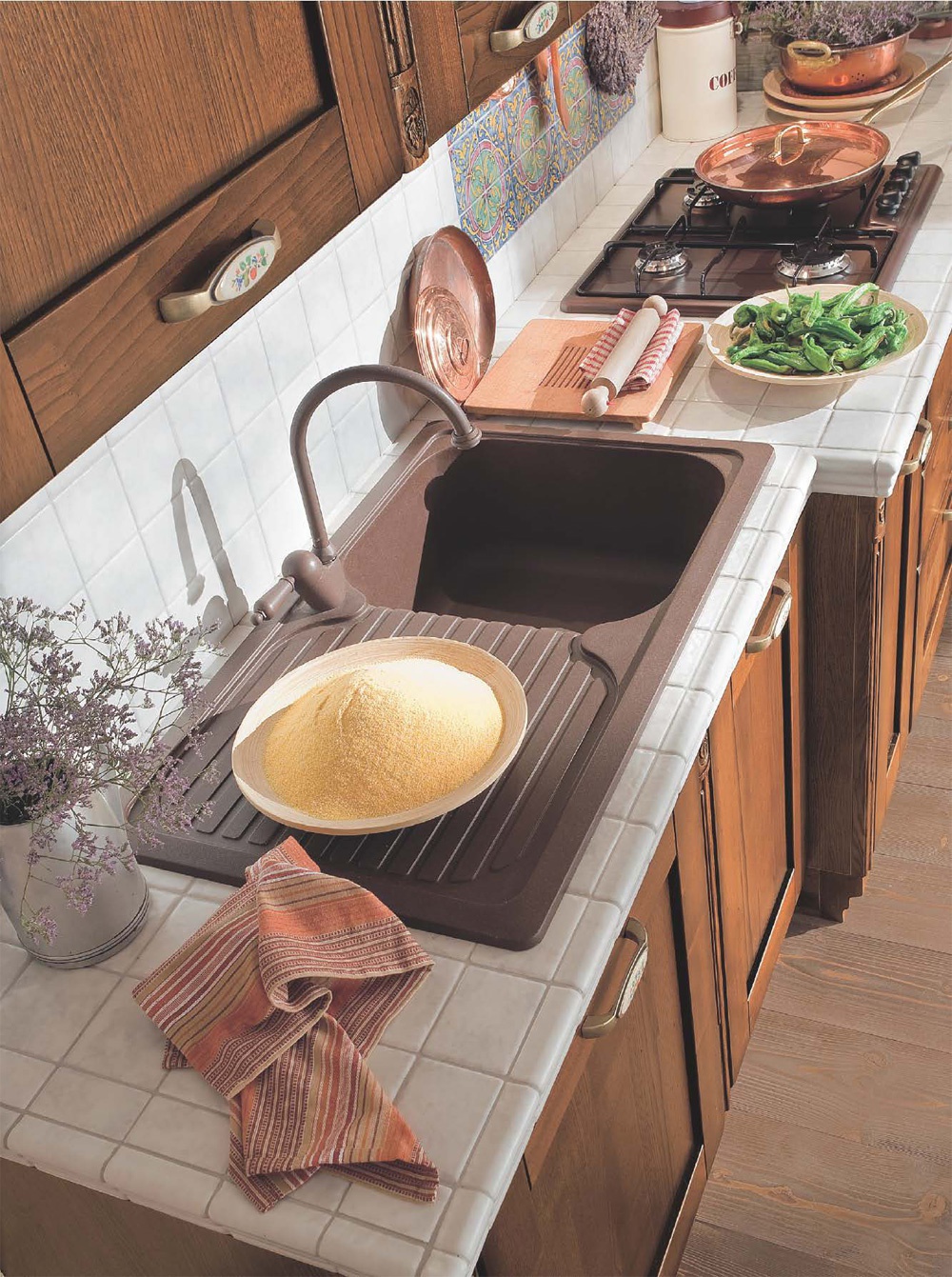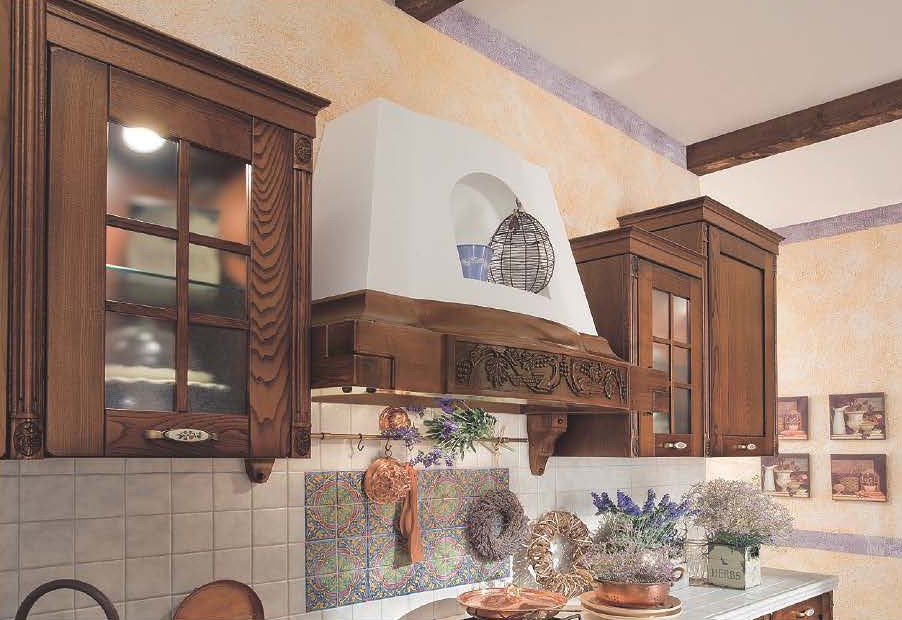 structure: wood facades: chestnut facades: Satinato (matte) handles: bronze countertop: ceramics hood: carved |