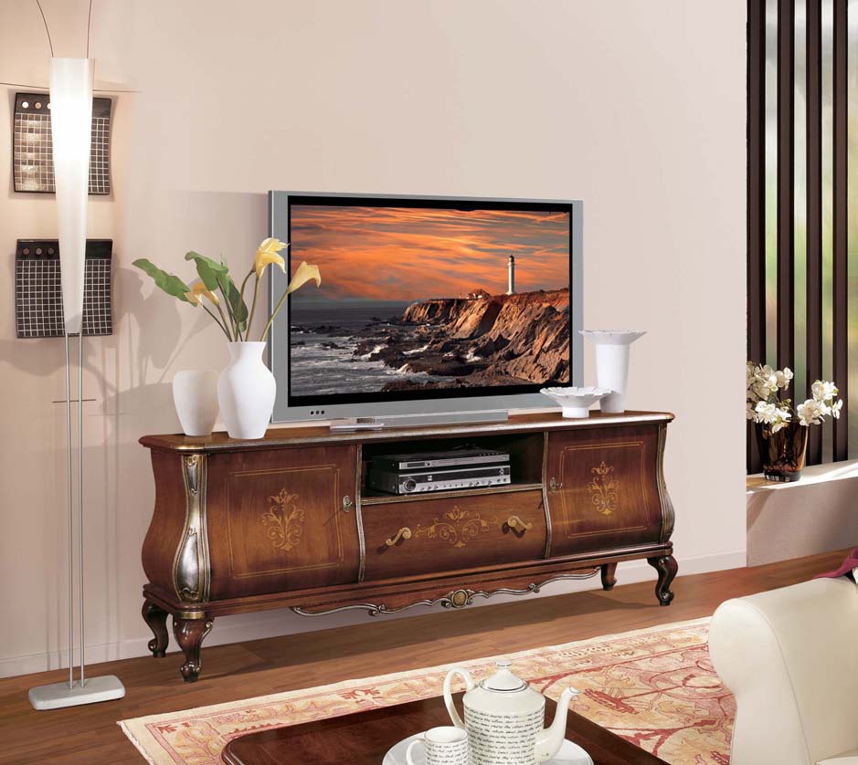 Tulipano sofa set from the Italian manufacturer Arve Style. This set includes: showcase on figured legs with glass shelves behind a door, drawer, dresser for TV. Products made from solid wood. Finishing - veneer out of range. The decor is exquisite carving handmade, inlay, gilding. Will fill the living room with elegance and sophistication.