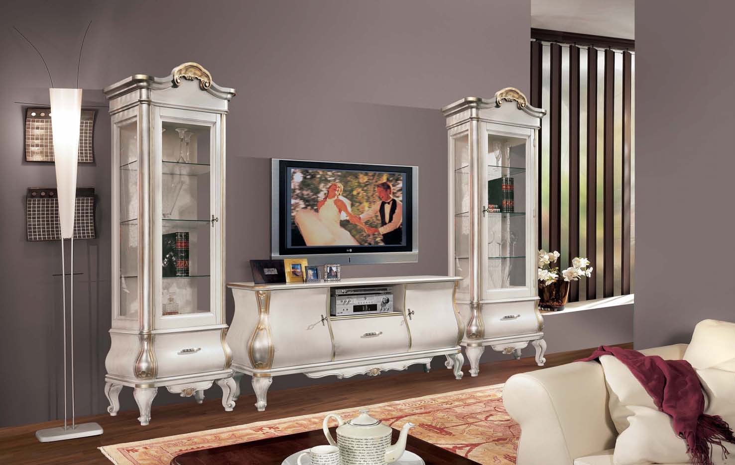 Tulipano sofa set from the Italian manufacturer Arve Style. Set consists of a showcase with glass shelves for door and drawer, cabinets for TV on figured legs . Products made of solid wood. The finish is white lacquer, it is possible to choose from the range. Decoration is elaborately carved, handmade, gold plated. Will fill the living room the charm and elegance.