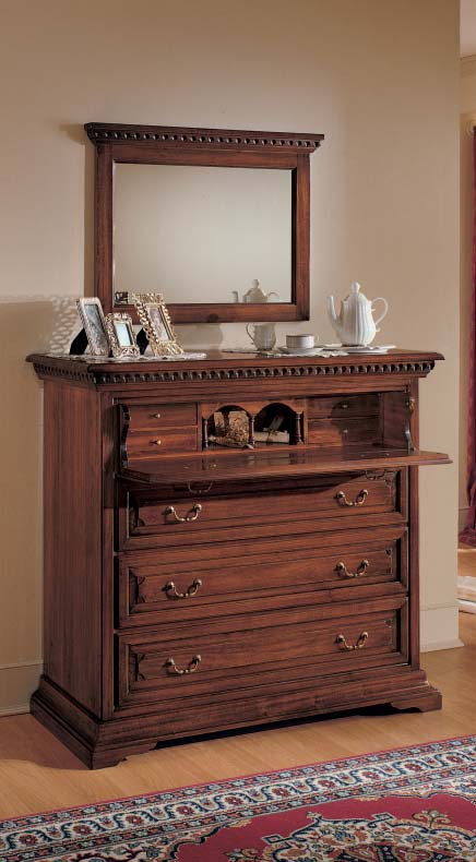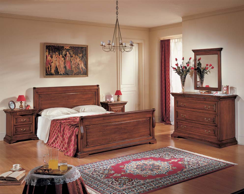 Set Casanova for bedrooms from Italian manufacturer Arve Style. This set includes: double bed with high headboard and footboard, bedside tables, chest of drawers (with 3-or 4-drawers, your choice), mirror, wardrobe with 4 hinged. Frame, frame products made from solid wood. Finish - veneer with profiled, your options are variations of walnut and cherry. Accessories metal. The decor speaks thread. Set ideal for a classic bedroom interior.