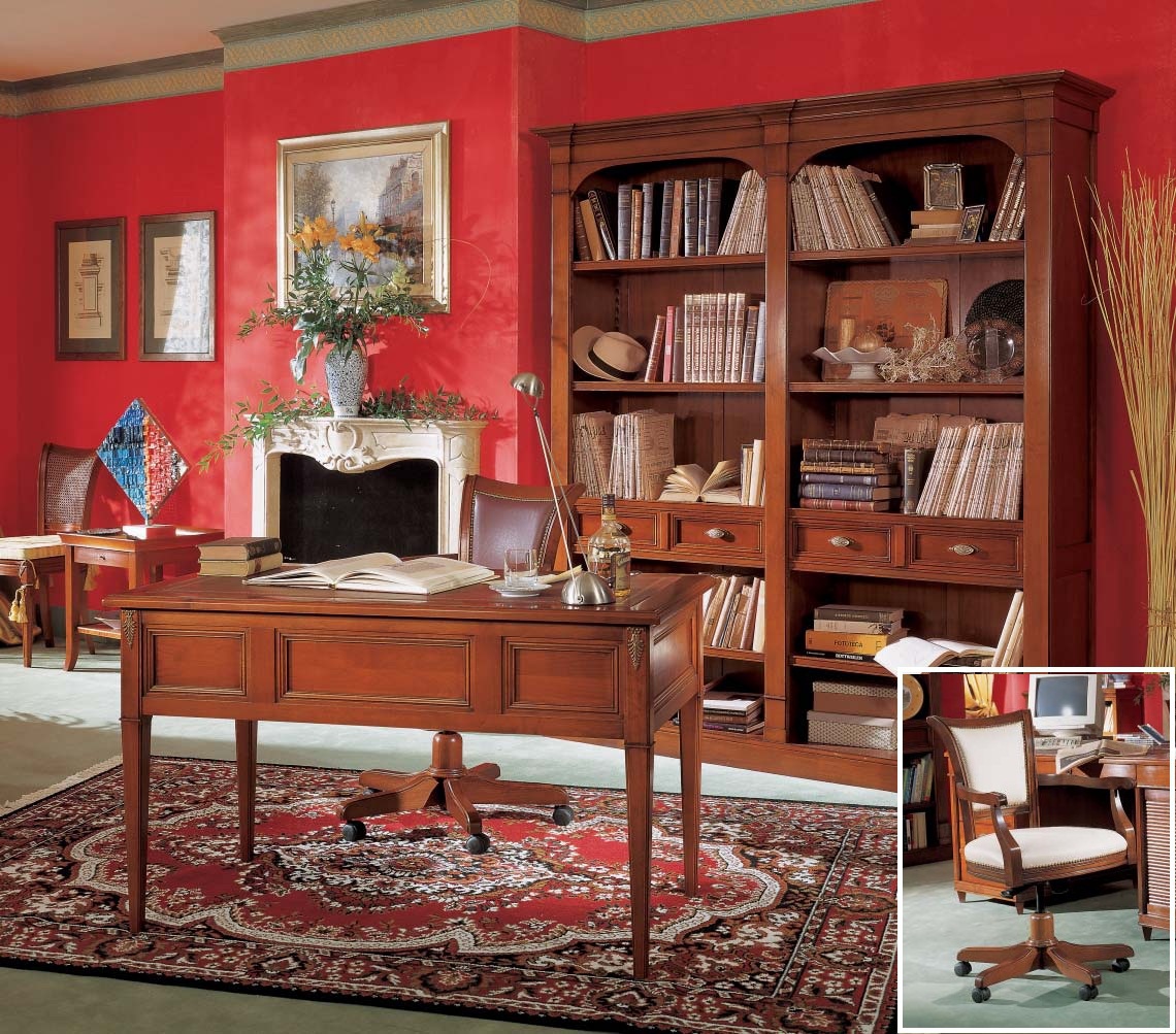 Headsets for office "direttorio" style from the Italian manufacturer Arve Style. This set includes: writing Desk on high legs, bookcase, chair of the working, in the skin, on a rotating yoke, the chair in the padding of straw. Frame, base, the table top is made of solid wood. Finished with veneer to choose from - walnut and cherry. Set in a classic style that will fill the Cabinet taste and style.