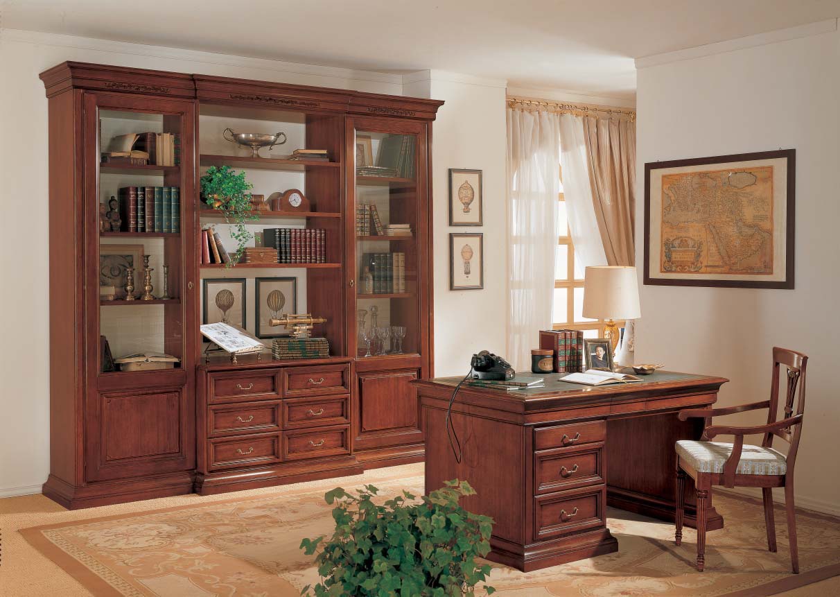 Headsets for office Edera from the Italian manufacturer Arve Style. Set in a classic style, consists of a bookcase with glass doors, drawers, Desk (offered 3 options, with leather top and not), the chair with armrests in soft upholstery fabric. Structure, fa?ade, table top made of solid wood. Accessories metal, fine. Finished with veneer of walnut or cherry to choose from. The facade profiled, lacquered. Headsets will make the room chic, severity and charm.