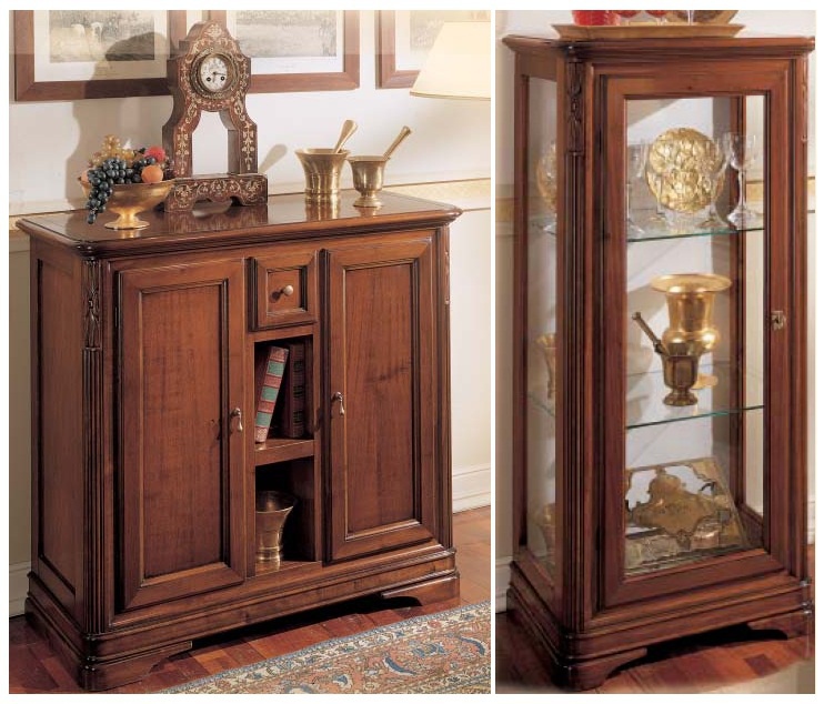 Melania set for the dining room from Italian manufacturer Arve Style. This set includes: folding dining table with oval or round top, to choose from, the chairs in upholstery fabric, with a high carved back, pedestal for TV, a sideboard, a low vitrine, sideboard with 2 hinged doors made of glass, and 2-I am deaf, and also with drawers. Set is made of solid wood. Finish made of veneer, with a choice of walnut or cherry. Exquisite fittings, of metal. Textiles - from the range of the manufacturer. Set in a classic style, decorate dining room, fill the room with warmth, sophistication.
