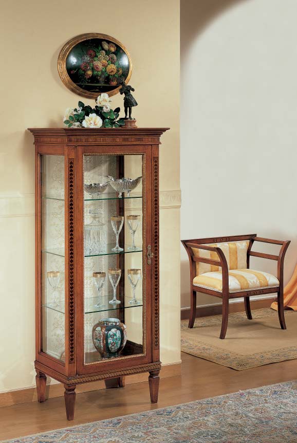 frame: solid wood finish: veneer accessories: metal shutters, shelves: glass finish: textiles decor: gilding |