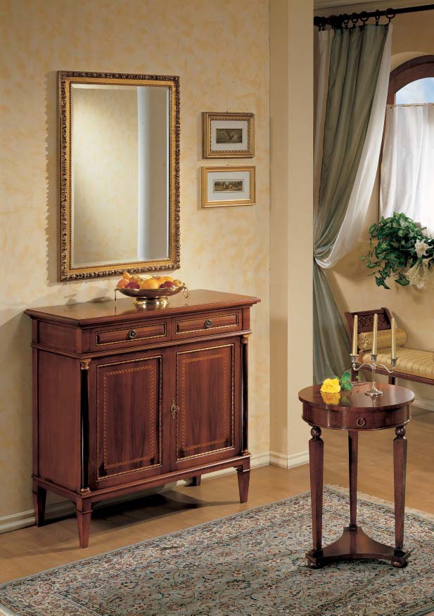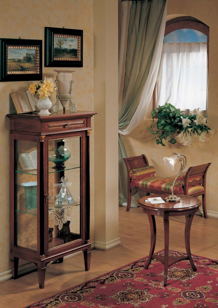 frame, base: solid wood finish: veneer accessories: metal fold, shelf: glass decor: gilding |