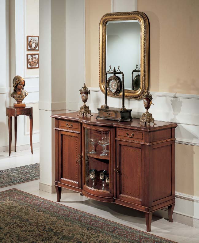 Sofa set Bomb? from the Italian manufacturer Arve Style. This set includes sideboard with 3 doors, Central glass, a wall mirror in a carved gilt frame of rectangular form with rounded corners, a small table with a round top, fitted a drawer. Set made of solid wood. The role acts as the finishing veneer on the manufacturer's catalogue, are available in walnut and cherry. Graceful fittings, metal. Set in a classic style, to decorate the interior of a living room, also, and will be indispensable in the lobby, will make a subtle touch of sophistication and charm.