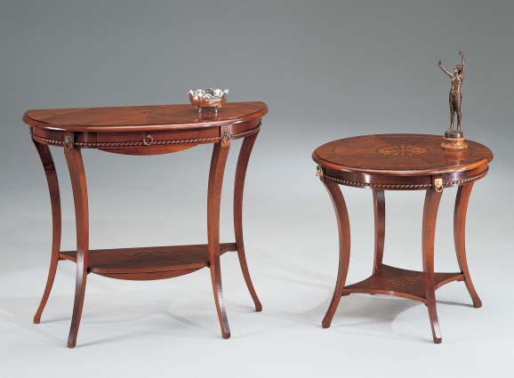 Sofa set Picasso from the Italian manufacturer Arve Style. This set includes the console in the shape of a Crescent and a set of tables with round, square and rectangular tops, they are perfect as pridivannogo, coffee or coffee tables. Frame, table tops made from solid wood, finish - veneer by the number of items. The console has a drawer, the tables are supplemented by a shelf. The main decoration of stands the exquisite inlay work, the highlight of the added metal in the form of a harness, rings. Headsets will be a wonderful decoration in classic interior living room, and modern.