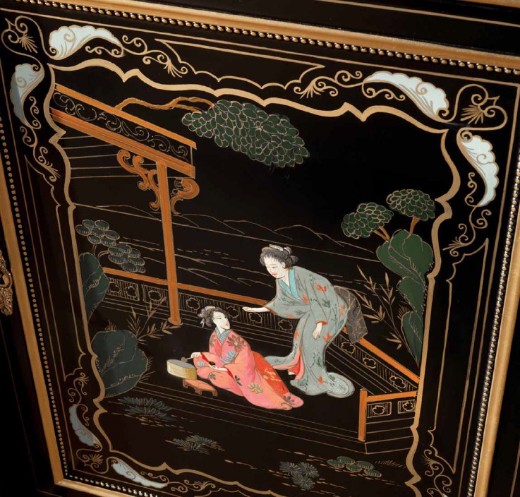 | Description: | A chest of drawers from Italian manufacturer Ezio Bellotti. Low sleek dresser with extended front, is made of wood in Baroque style, decorate any bedroom, boudoir or living room. Three compartments with hinged doors and three pull-out drawer allow you to place linens and jewelry. Curly top is made of dark veined marble, drawers, lockers, decorated with exquisite carved furniture. The surface is lacquered black varnish and painted genre scenes in Japanese subjects. The sides of the drawers with carved, panels and the lower edge decorated with gold. Colors - black, gold, multi-color; trim in the photo. |