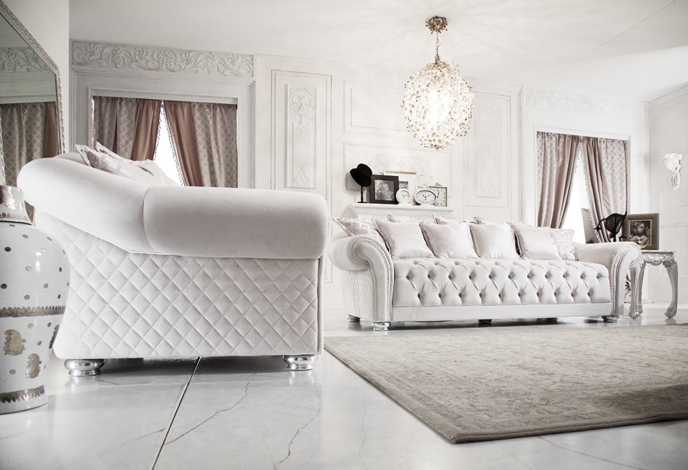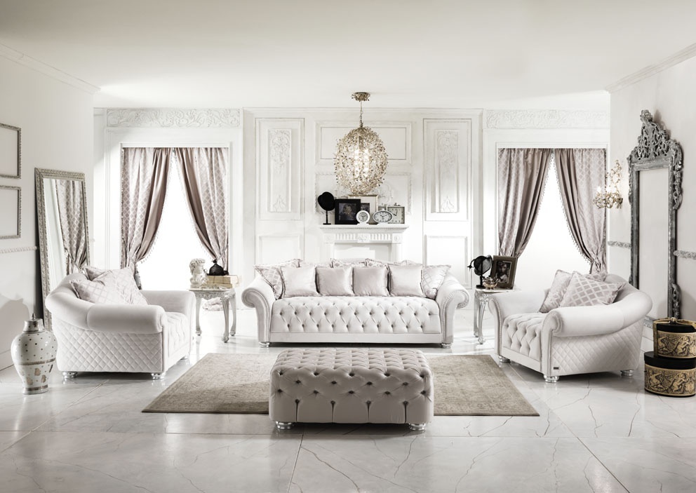 Lilia sofa set Italian manufacturer Keoma Salotti. The presented model triple, twin sofas and pouf. The furniture is made on a wooden frame, upholstery made of high-quality textiles. Color scheme in white. Set is made in a classic style. Perfect solution to complement the interior living room.