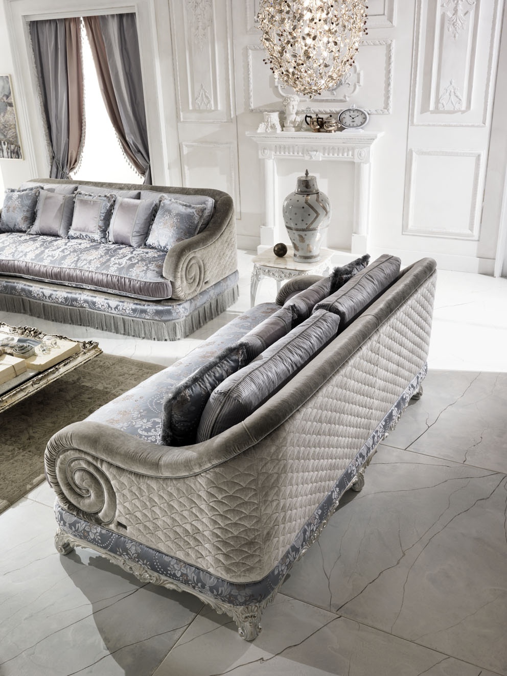 Gloria sofa set Italian manufacturer Keoma Salotti. The presented model is a quadruple and triple sofas. The furniture is fully upholstered in fabric, armrests are original plating. Color scheme in shades of gray. Pillows removable sofas. Made in the classic style. The perfect solution for interior living room.