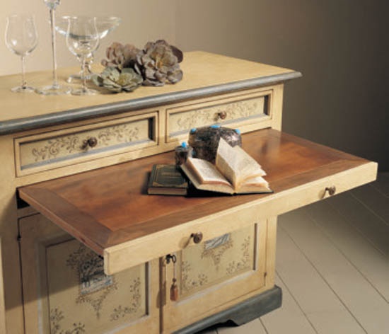 The Perugina chest of drawers from Italian manufacturer Tiferno Mobili. The model includes a section with hinged doors, two drawers and a sliding table. The frame is wooden. Finish the catalog of the company. Accessories metal. Decoration is a decorative painting handmade.