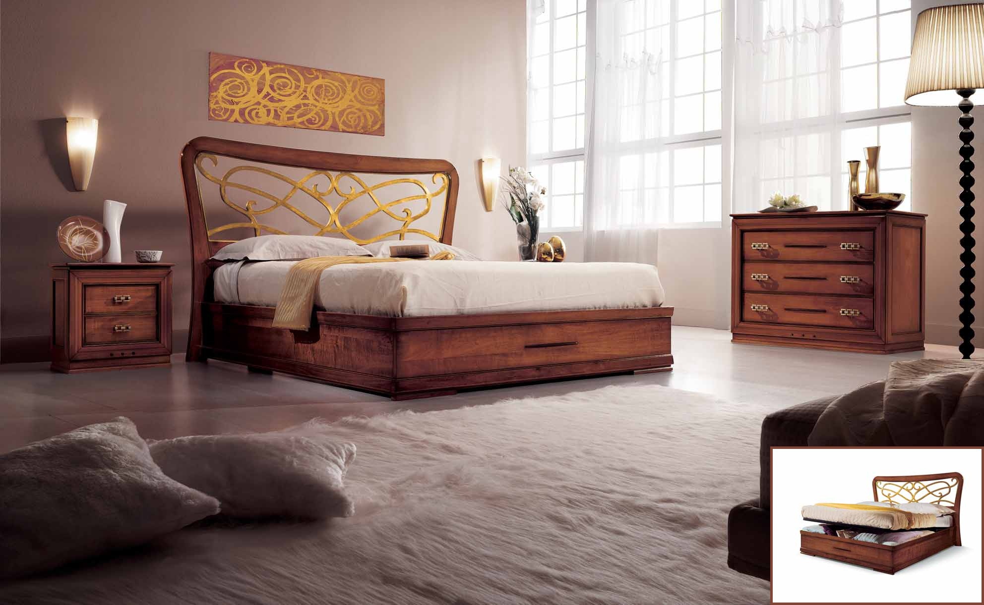 frame, base: solid wood veneer: walnut accessories: metal coating: lacquered furniture, headboard: gilding |
