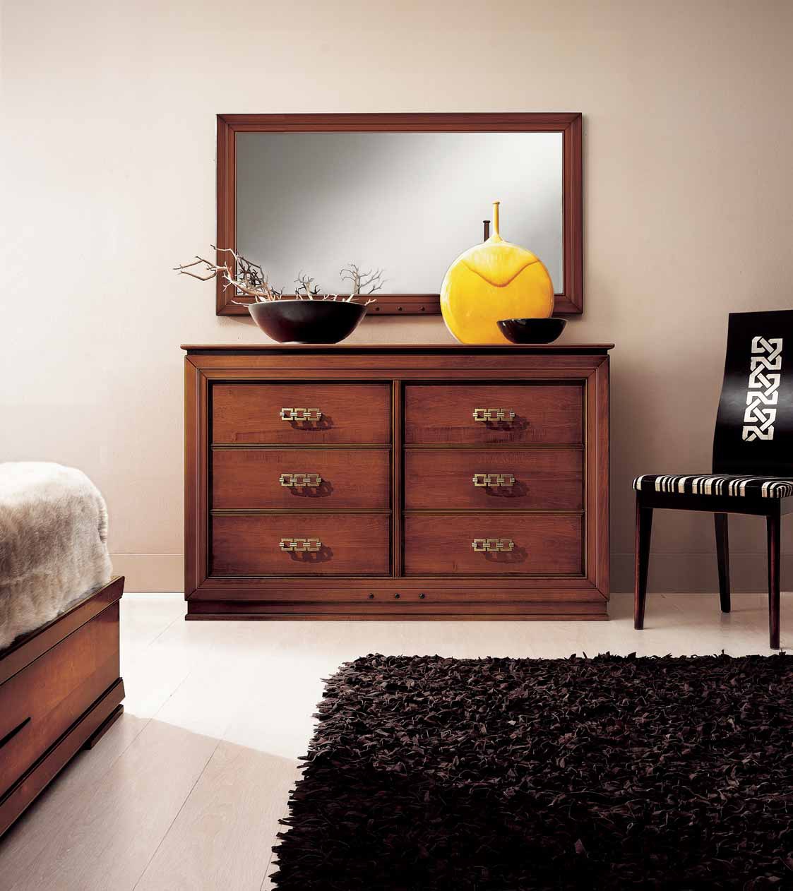 Set for bedroom Sogni from the Italian manufacturer Arve Style. Set consists of a double bed (with container and without) with high carved headboard in moka lacquer shade, bedside cabinets with 3 drawers, dresser with 6 and a secret section under the top wall mirror in rectangular frame. The frame base is made from solid wood and finished in veneer of walnut. Accessories are fine, in gilt. Neoclassicism in design, modernity and adaptability in the performance - an essential combination for a perfect headset.