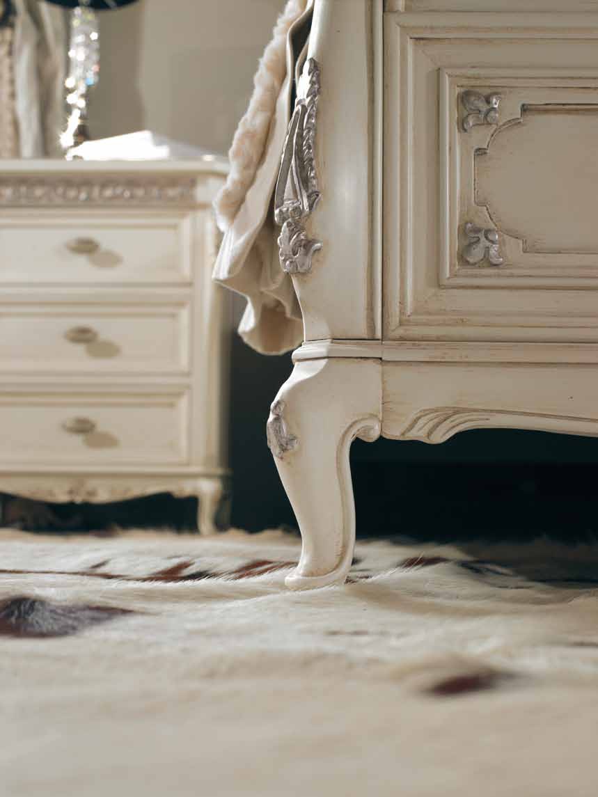 Bed Villa from the Italian manufacturer Arve Style. Model double, with a high headboard and footboard, on figured legs. Frame, base made from solid wood. The surface is covered with white lacquer. Elaborately carved handmade covered with silver leaf, which gives the product delicacy and charm. Bed in a classic style, perfectly fit into traditional and modern interiors.
