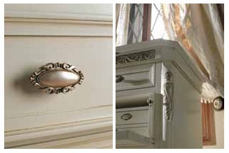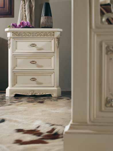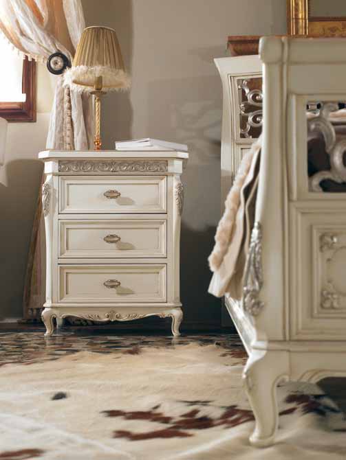 Villa stand from Italian manufacturer Arve Style. The manufacturer offers 2 options product based and figured legs. Bedside Cabinet, fitted 3 drawers. Frame, base made of solid wood. Surface lacquered white, artificially aged. Accessories metal, in silver. The ornament is represented in the form of thread hand carved and covered with silver leaf, which gives it elegance and finesse. The product is a classic, perfectly complement the bed from the same collection.