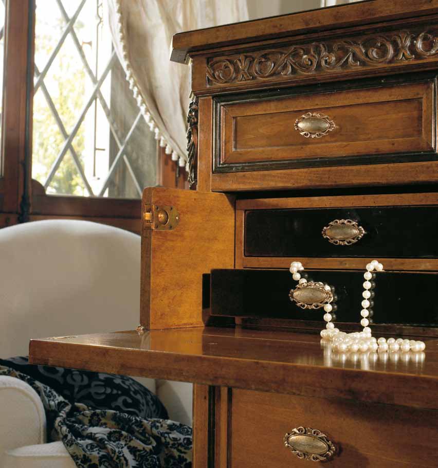 The Villa chest of drawers from Italian manufacturer Arve Style. The product on a low carved legs, retractable tables and a niche over the door. The frame base is made of solid wood. The quality of finishes selected walnut veneer. The surface is covered with varnish. Metal hardware, in gold foil. The main decoration of stands carving, made by hand. This is the detail that gives the product elegance and sophistication. Product in a classic style will fit harmoniously into classic and modern interiors.