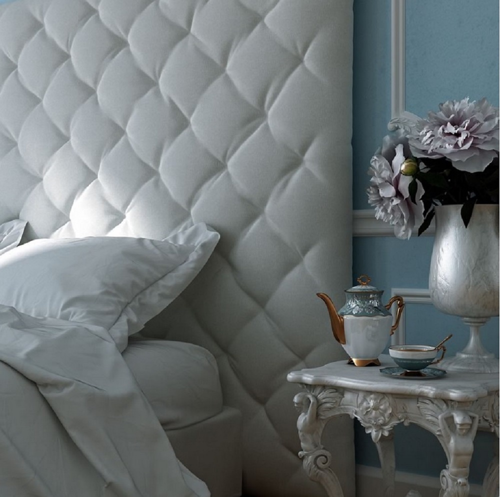 Bed Amaila single or double from the Italian manufacturer IneditoMilano. Bed design made of metal and solid wood. The filler of polyurethane foam. The high upholstered headboard is decorated with stitch-Capito. The upholstery is available in fabric or leather to choose from the range of the manufacturer. The bed comes with a slatted grille, orthopedic panel with padding or the container with the rack bars. Great option for a bedroom or teen room in a modern style with elements of art Deco.