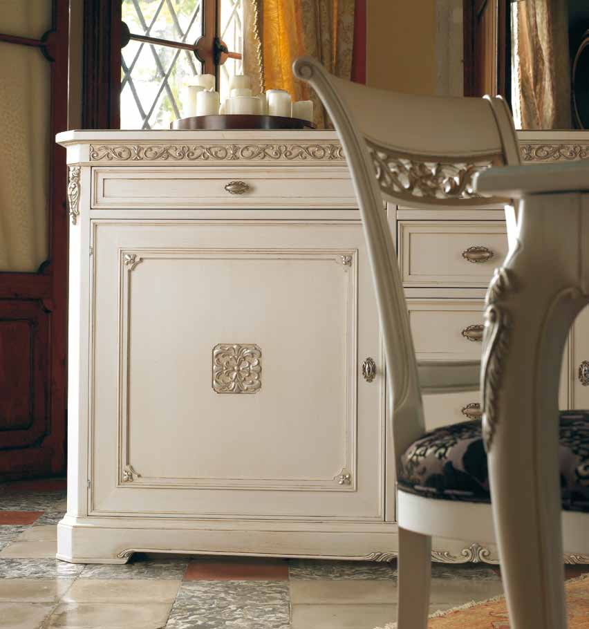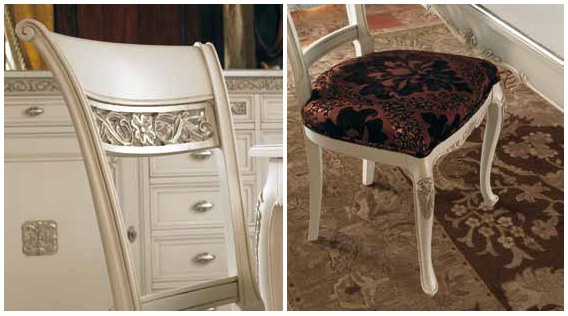 Chair Villa from the Italian manufacturer Arve Style. A product with a high back on curved legs. The frame is made from solid wood. Surface Matt lacquer finish in white color. The model is decorated with hand carved leaf in sterling silver. The upholstery is made of textile. A broad range of textiles to choose from. Chair in a classic style, will be a great addition to the dining table from the same collection.
