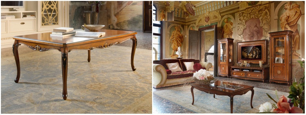 Sofa set Villa from the Italian manufacturer Arve Style. This set includes: coffee table, showcase single-leaf, shelves for TV, as well as the unusual element - panel TV, it will turn a modern item into a picture, framed in a luxurious frame. Products made from solid wood, finished in walnut. The decor is exquisite carving handmade, some carved details covered with gold leaf. Set in a classic style that will fill the interior with luxury, wealth.