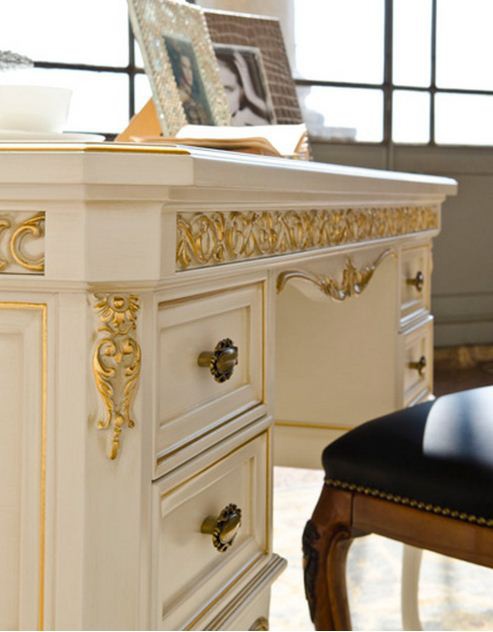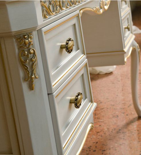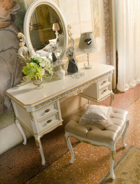 Set for bedroom Villa from the Italian manufacturer Arve Style. This set includes a table, stool soft, quilted, textiles, wall oval mirror. The table is equipped with drawers that can act as dressing or writing. Products made from solid wood. Surface Matt lacquer finish, colour - white. As a decoration - carvings hand carved and covered in gold leaf. Set in a classic style fills the interior with elegance and sophistication.
