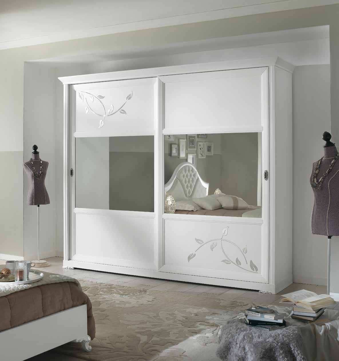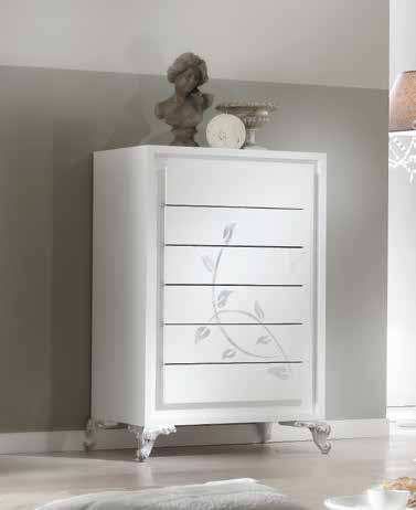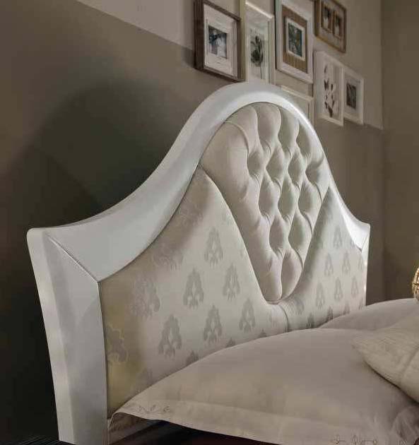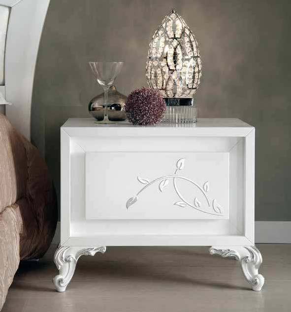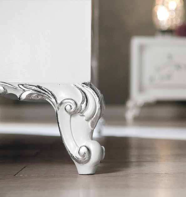 Set for bedroom Camelia from the Italian manufacturer Arve Style. The set consists of a double bed with high headboard in textiles, bedside tables, chest of drawers, wall mirror, wardrobe. Frame, base, frame made from solid wood. Finish white lacquer stands. Set is decorated by carved elements in silver, painted silver. Set in a contemporary style, a great choice for stylish bedrooms. Offers a wide selection of textiles.