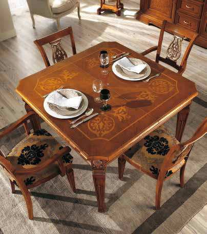 Set for the dining room Lux Vivre from Italian manufacturer Arve Style. The set includes a dining table with square table top, chairs in upholstery textiles. Frame, base, countertop - solid wood. As decoration used walnut. Textiles for upholstery available in a wide range. The table top is decorated with inlay, legs and back are elaborately carved handmade. Set in a classic style. Will fit harmoniously into the refined dining room.