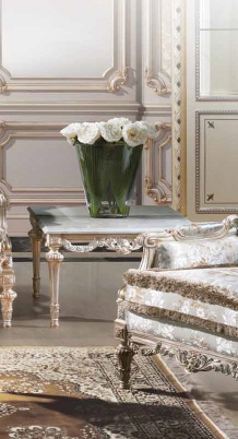 Pridivannogo table from the Italian manufacturer Ezio Bellotti. Small square table on the wooden frame, made in the style of Louis XVI, will help to structure the space of the living room, hall or boudoir. The frame and legs carved with a silver finish. The table top is made from Carrara marble, a wooden base, decorated with carved garlands. Colours in stock.