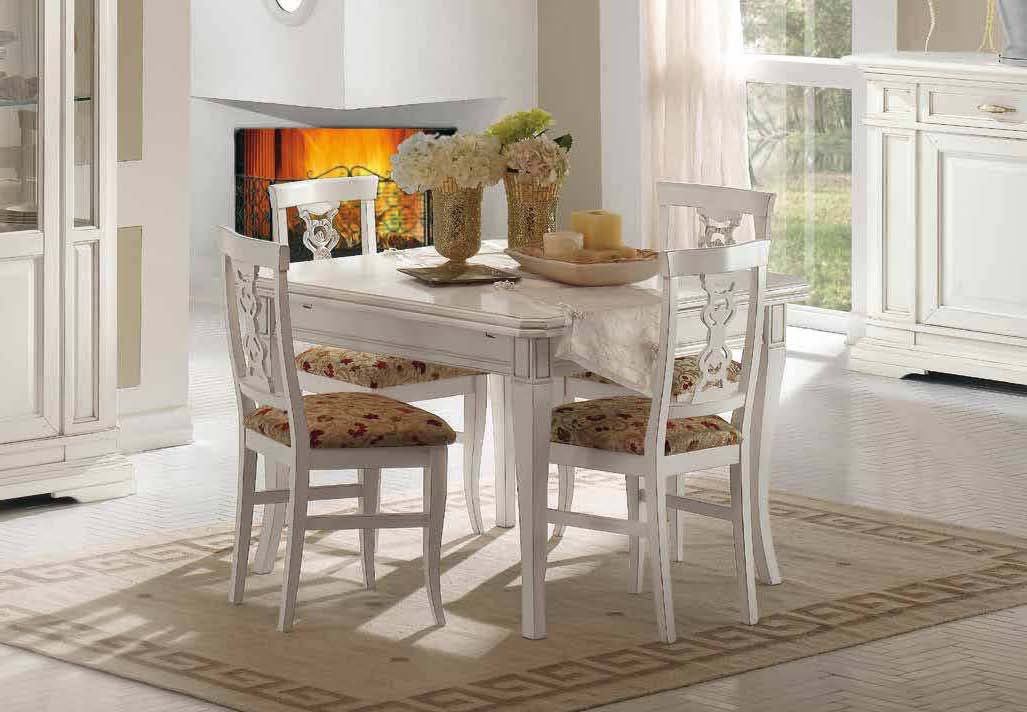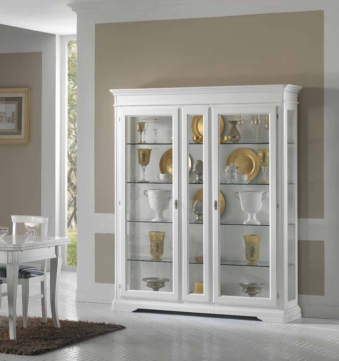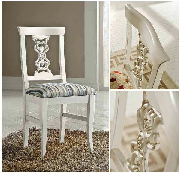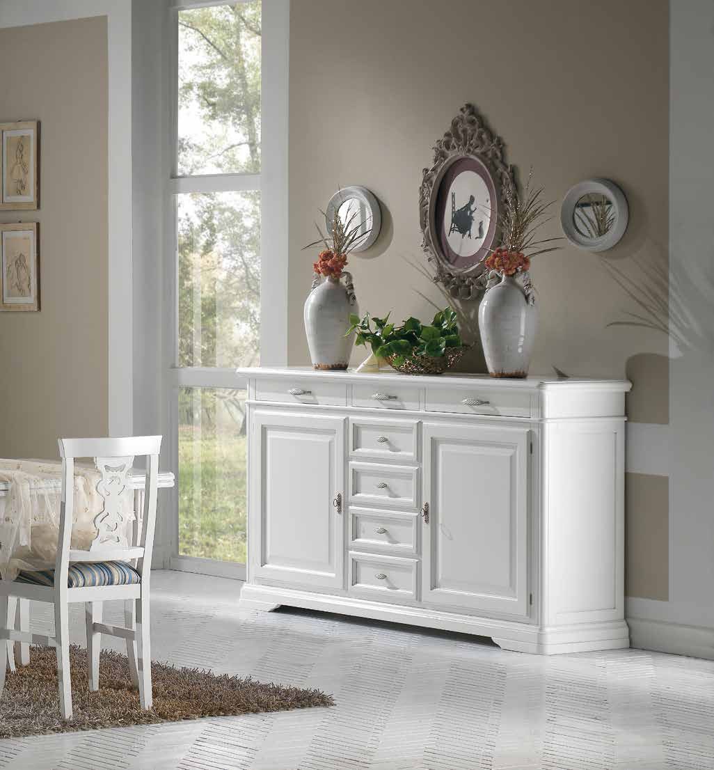 Stile set for the dining room from Italian manufacturer Arve Style. The furniture set includes: dining table, sofa, chairs with carved back, textile upholstery, Cabinet with doors, sides, shelves made of glass and a snack bar. Frame, base, top made of solid wood. Finish - white Matt lacquer. Accessories metal, silver. Textiles for upholstery is out of range. Set in a classic style. Fill the room with elegance and sophistication.