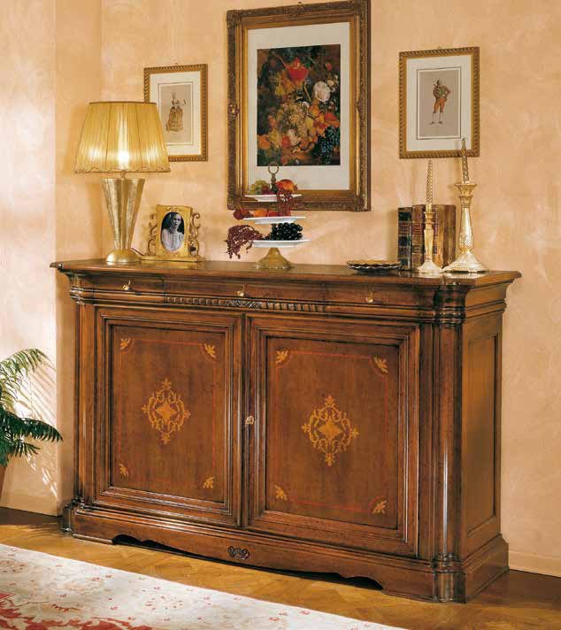 frame, base: solid wood finish: walnut accessories: metal shutters, shelves: glass coating: lacquered decor: inlay decor: carved |
