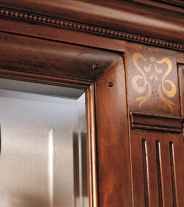 frame, base: solid wood finish: walnut accessories: metal shutters, shelves: glass coating: lacquered decor: carved decor: inlay |