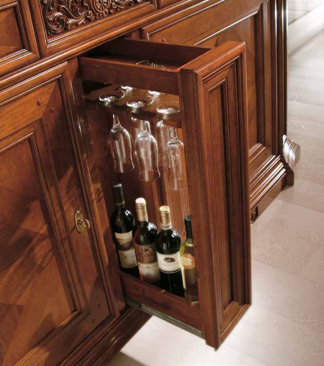 A snack bar Lux Vivre from Italian manufacturer Arve Style. Model with 2 hinged doors, sliding drawers, one of which acts as a bottle holder. Frame, base made from solid wood. As acts finishes walnut veneer. Accessories metal, in gilt. The fa?ade is decorated with the profiles. The decor is exquisite inlay. Buffet in classic style, perfectly fit into living room, dining room.