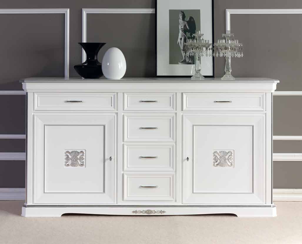 A snack bar Exclusive from the Italian manufacturer Arve Style. The product is equipped with 2 swinging doors and 6 drawers. Frame, base made of solid wood. The finish is white lacquer with a Matt finish. The housing is profiled. Accessories metal, silver/Golden. Decoration is carved wooden decoration in leaf silver/gold. Buffet in classic style. A perfect fit for both classic and modern interiors.