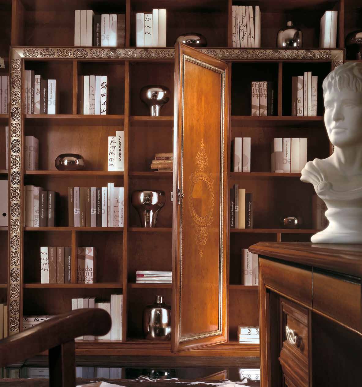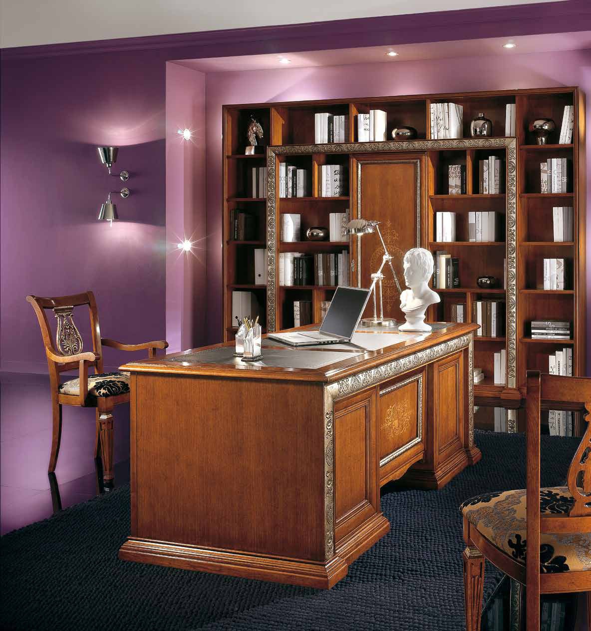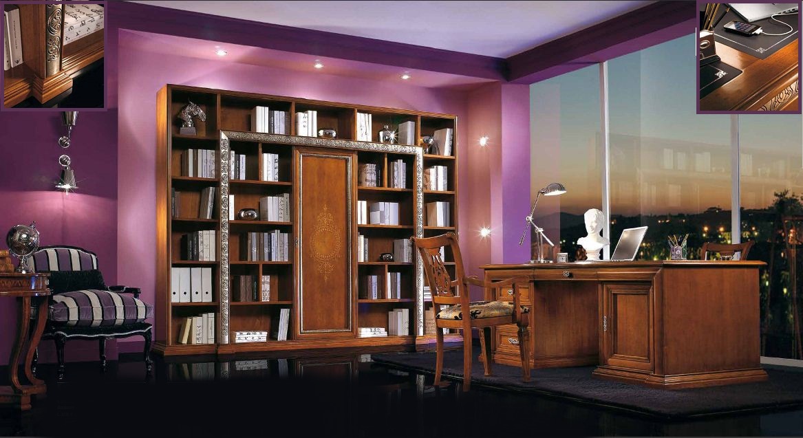 Headsets for office Vivre Lux from the Italian manufacturer Arve Style. The set includes: a Desk, a book shelf, a chair with or without armrests in upholstery catalog. Frame, base, the table top is made of solid wood. Trim stands walnut veneer. Graceful fittings, metal. Performs skilled decor inlay and carving handcrafted in silver/gilt. Set in a classic style that will fill the Cabinet with luxury, chic.