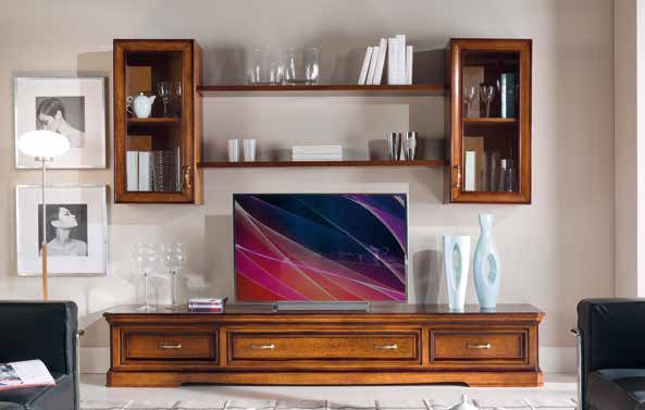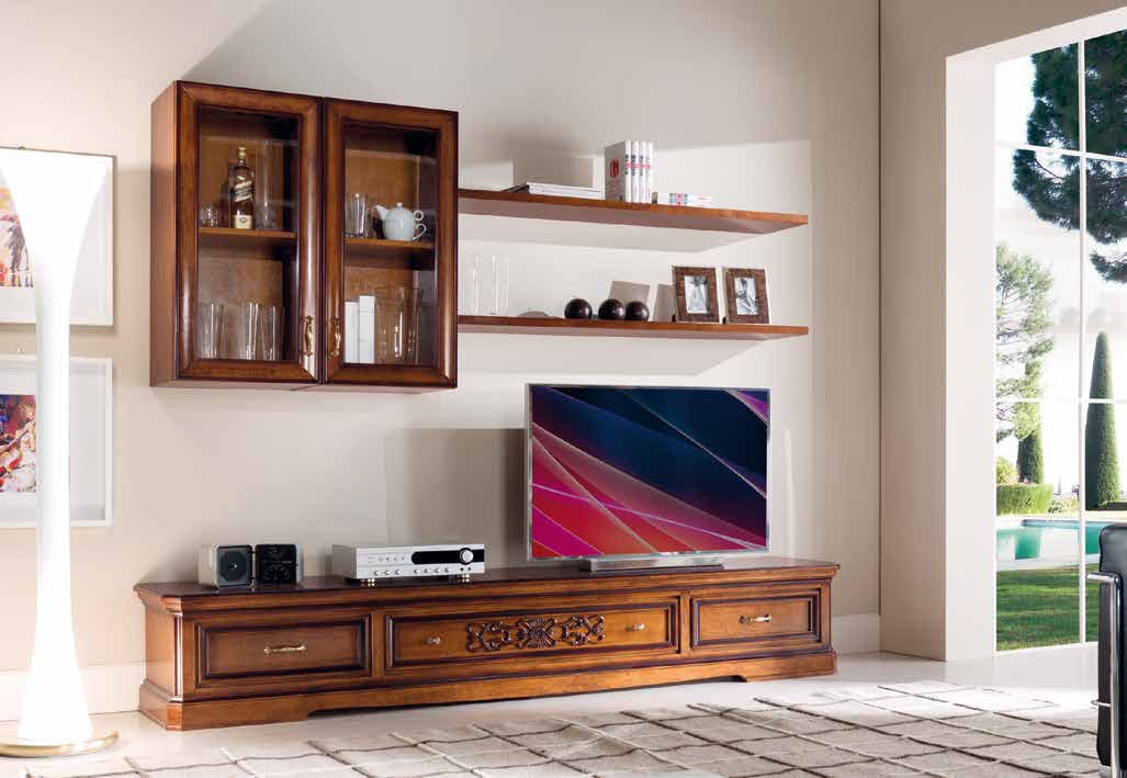 Modular system for TV Exclusive from the Italian manufacturer Arve Style. The system consists of cabinets for TV, wall cabinets with glass doors, 2 shelves. Frame, base made from solid wood. The top walnut veneer. Accessories concise, and metallic. Decoration could be hand carved. Product in a classic style, perfectly fit into the interior of the living room.