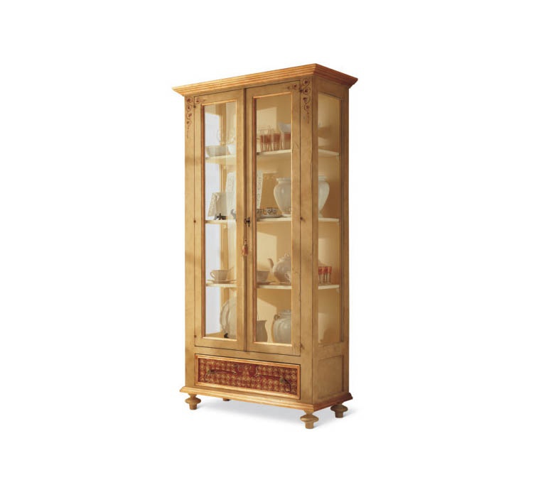 Cabinet Senese from the Italian manufacturer Tiferno Mobili. Model with shelves and drawer. The body and legs of wood. The sash and the sides glazed. There are several options for finishing. Accessories metal.