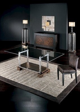 AXO dining table from Italian manufacturer Smania. The model is made in modern style. Legs with metallic finish in gold. Glass worktop, niche made of solid wood.