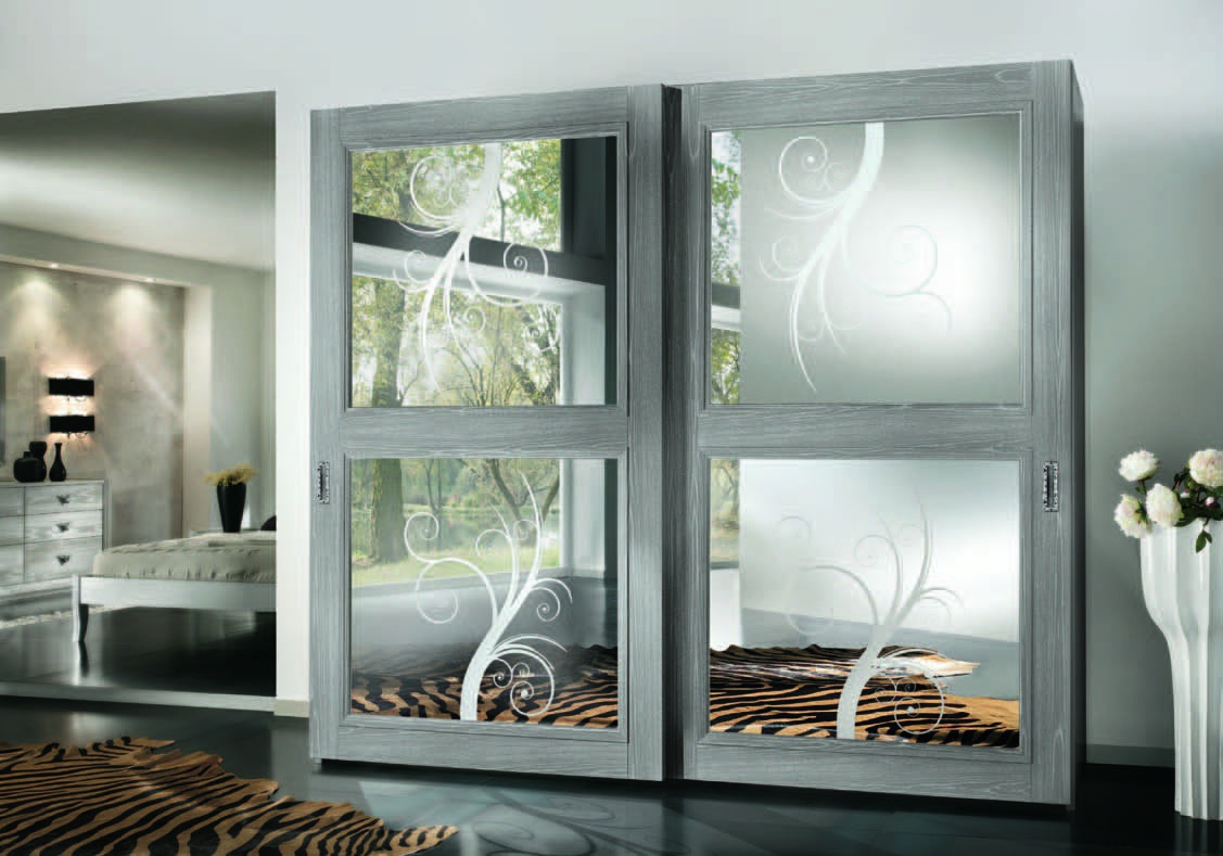 Cabinet Giselle from the Italian manufacturer Arve Style. Wardrobe with 2 sliding doors in mirrored glass. Frame, base made from solid wood. Finish - wood veneer from the range in a glossy lacquer in silver-gray color. Choice of lacquer from the range. The surface is porous. Accessories metal, in silver. The decor is a floral ornament. The style is modern. Fit perfectly into the stylish interior.