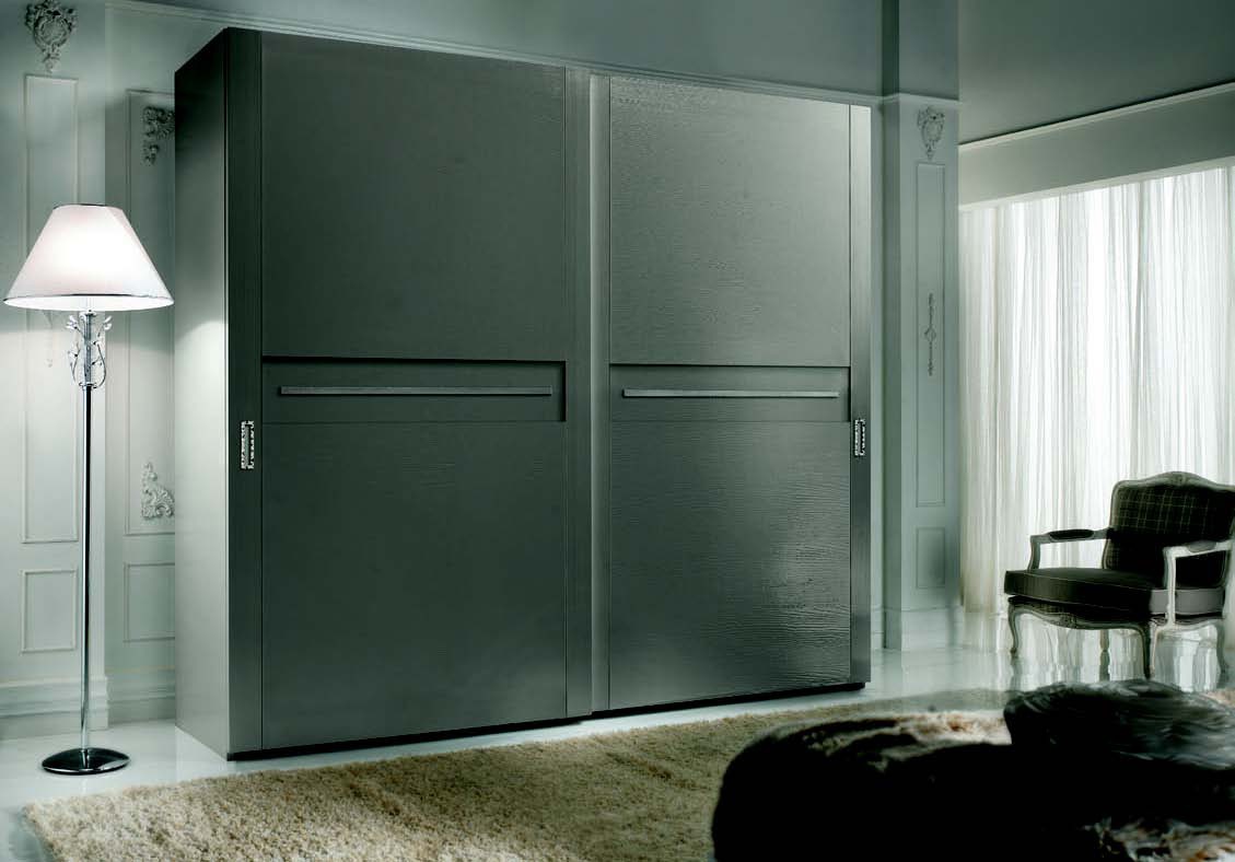 Cabinet Giselle from the Italian manufacturer Arve Style. Wardrobe with 2 sliding doors. Finishing - veneer out of range. The surface is lacquered in gray. Choice of lacquer from the range. The surface is porous. Accessories metal, silver foil. The style is modern. Fit perfectly into the stylish interior.
