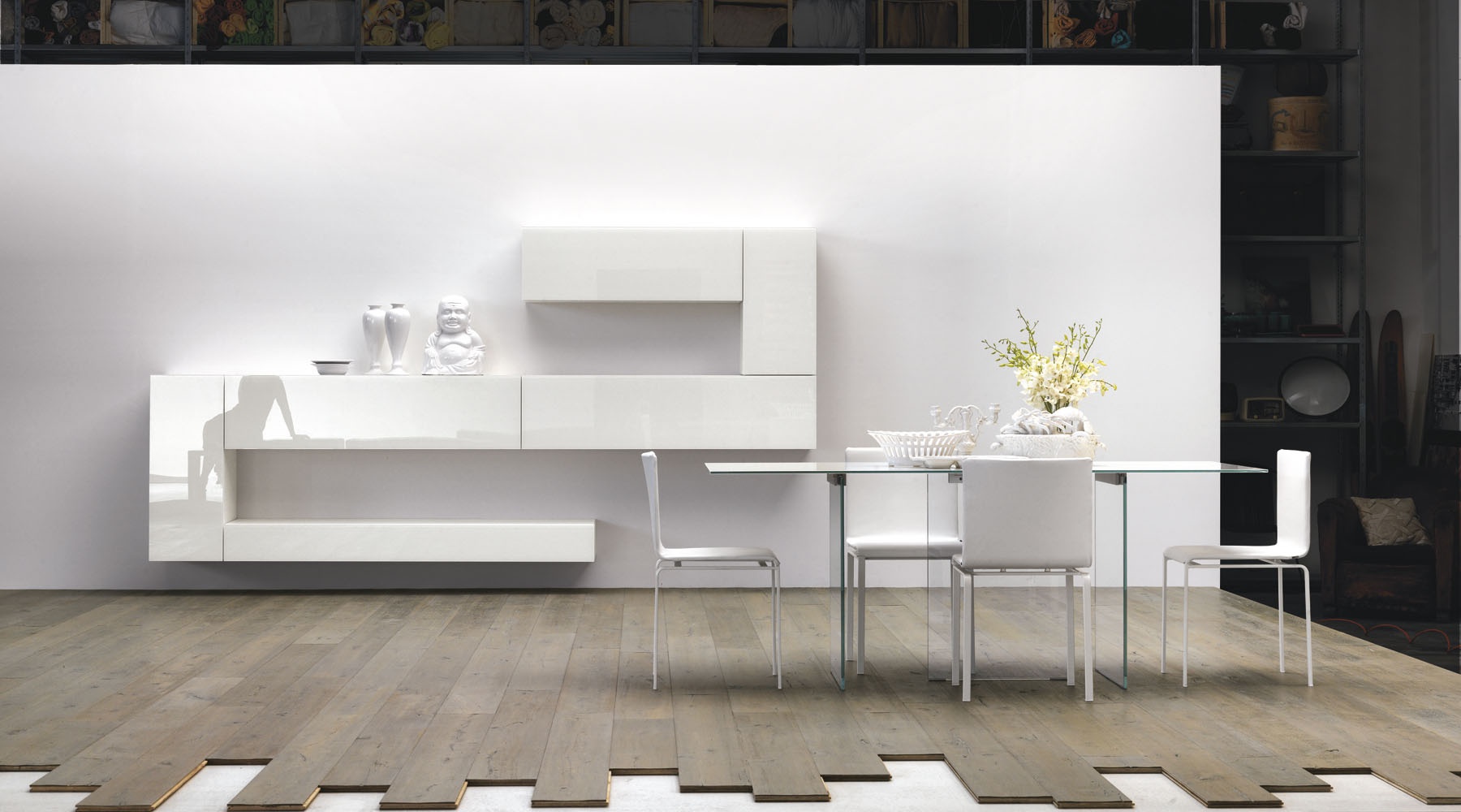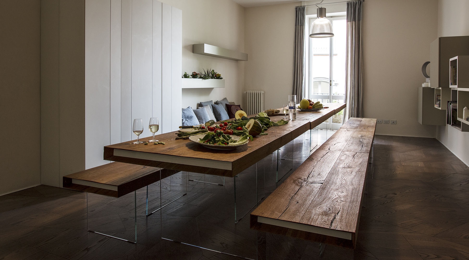 The Air table from Italian manufacturer Lago. The model is made from glass, top from solid wood. Airy, elegant, generous, light and designed for life that is happening around him. This table is perfect for kitchen, living room or office. A good choice for interior design.