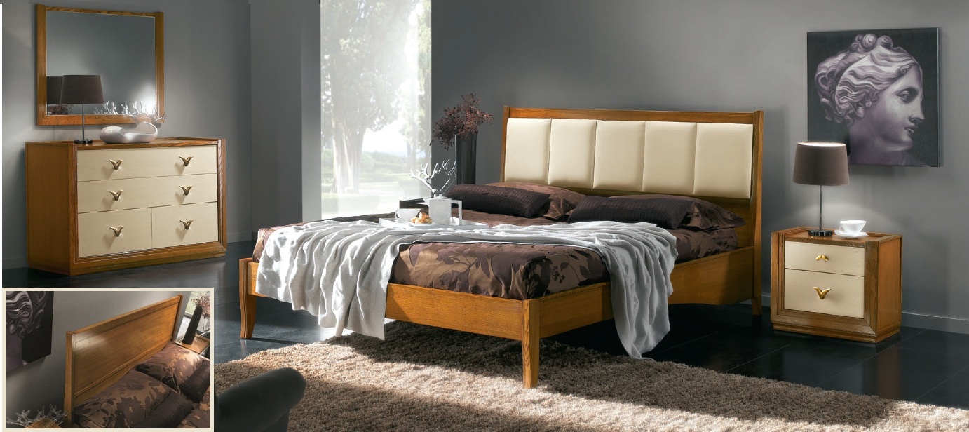 Set for bedroom Giselle from the Italian manufacturer Arve Style. The set includes: double bed with high headboard in leather/veneer, choice, bedside tables, chest of drawers with 4/5 drawers, mirror, wardrobe with 2 sliding doors. Frame, base, frame made from solid wood. Trim stands light walnut veneer in combination with a Matt lacquer shade of ivory and other shades, according to the catalogue. The porous structure. Accessories metal. Set in a classic style, perfect choice for your modern bedroom interior.