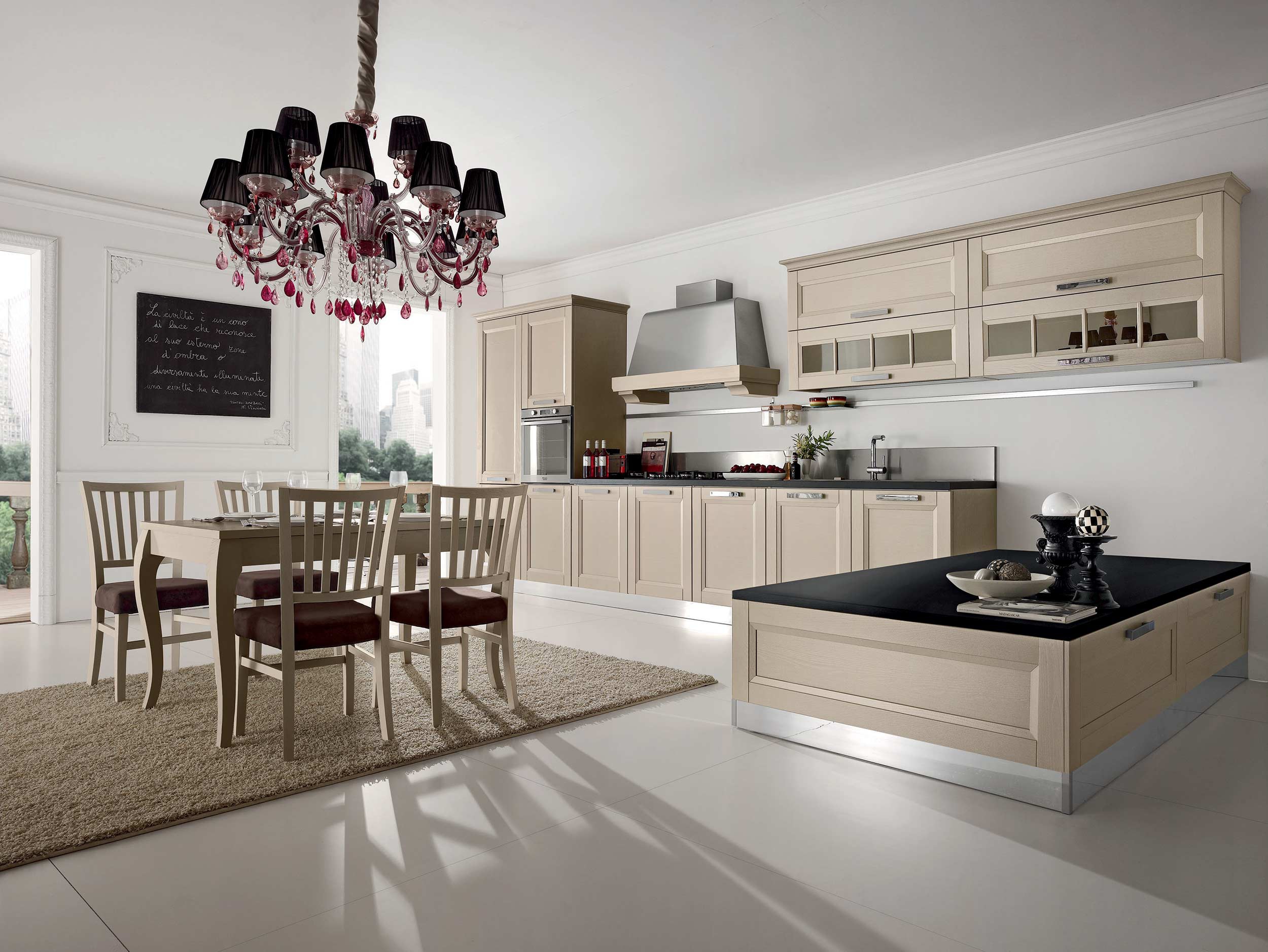Kitchen (kitchen set) Beverly from the Italian manufacturer Stosa. The case is wood. Finish - Matt lacquer. Glass sash. Fittings - chrome-plated steel. The model is made in modern style. Colours in stock.