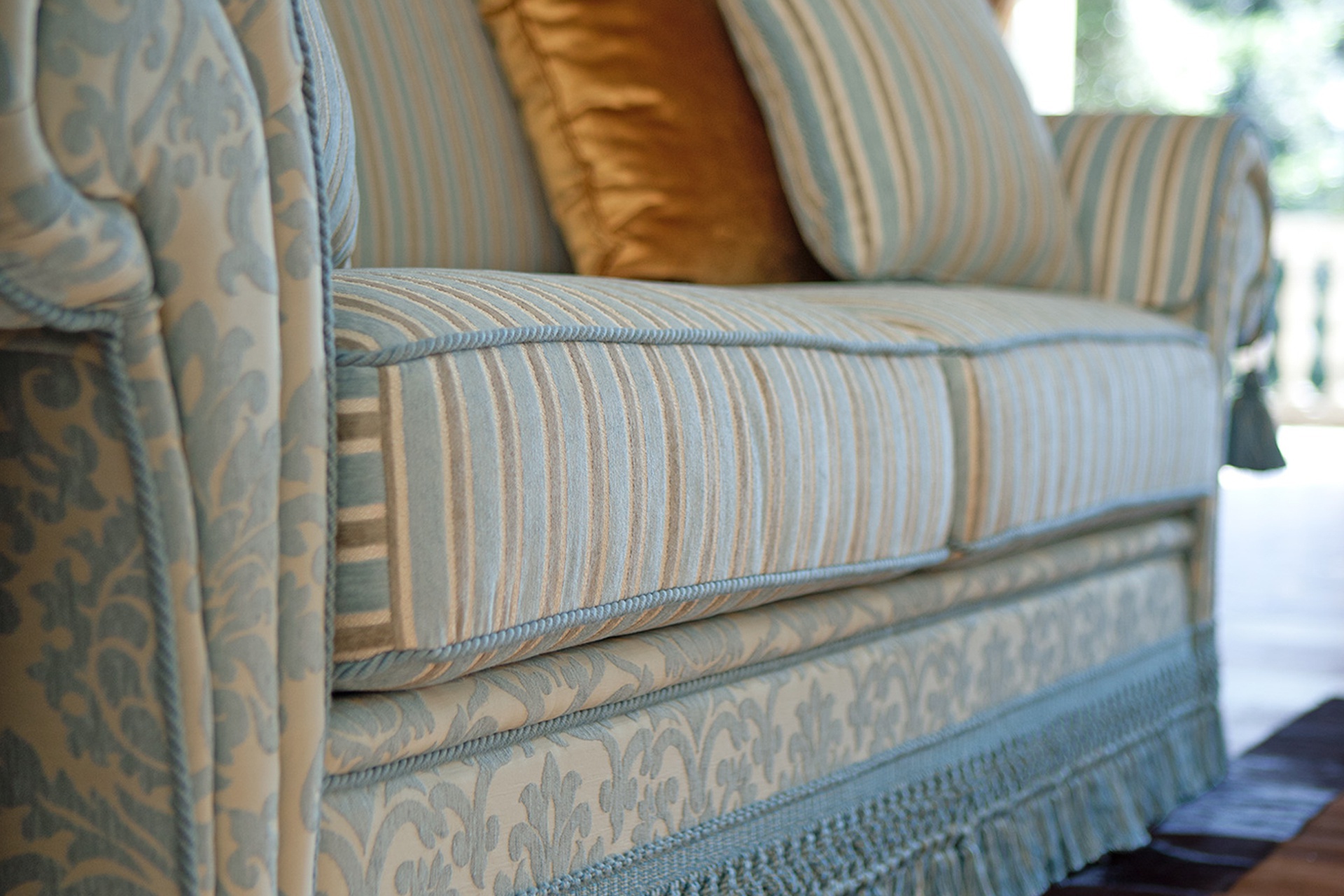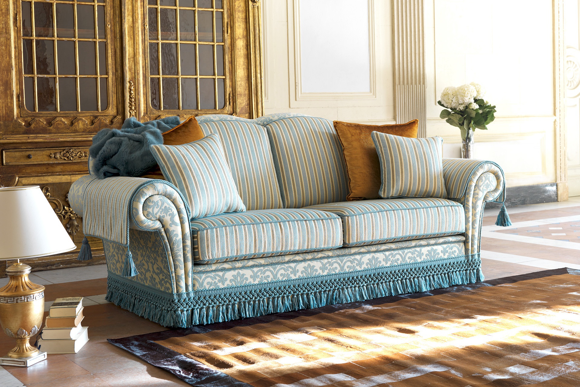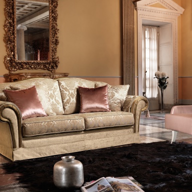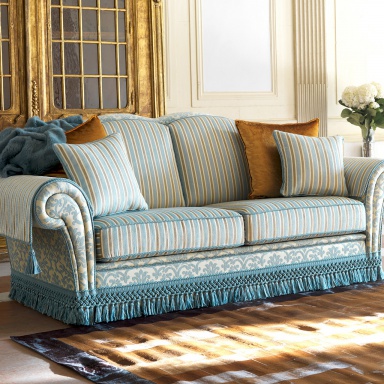 Three seater sofa bed from the collection of Arthur Home from the Italian manufacturer Domingo Salotti. Model a convertible Suite, designed in classic style. Material - composite wood, frame is made of poplar wood and pine. Welded steel mesh in three additions, filler - polyurethane foam of different densities. Mattress height 8 cm covered with a cotton canvas. Available double and triple models. The back is curly, the bottom of the sofa trimmed in fringe. Also available in spring version and finish the hem. Upholstery - textile plain or printed from the company portfolio. The terrain of the sofa is finished with piping; rolled armrests covered with capes with tassels. Complement a set of decorative pillows. Colors to choose from a collection company.