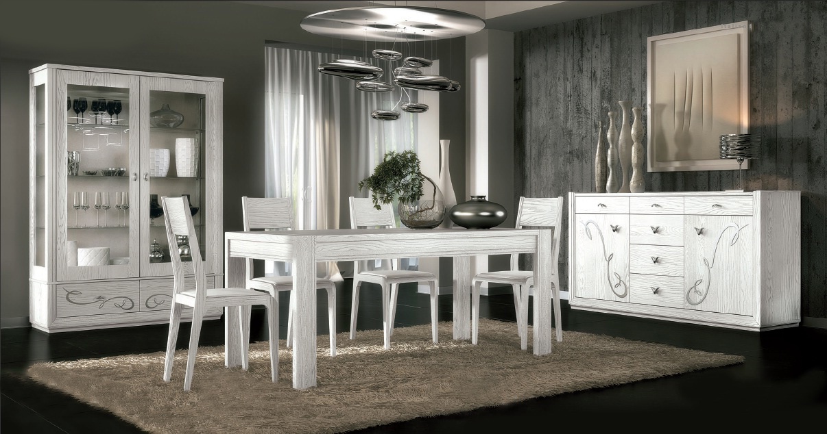Giselle set: dining from Italian manufacturer Arve Style. The furniture set includes: dining table sofa, chairs, sideboard and showcase. The frame base is made of solid wood. Trim - porous veneer. The surface is covered with white lacquer with silver patina, this technique gives the product texture and depth. Accessories metal, refined, in sheet silver. Decoration is a silver flower ornament. The headset modern design with classic lines. Perfect choice for your stylish interior dining room. To choose a rich shade palette.