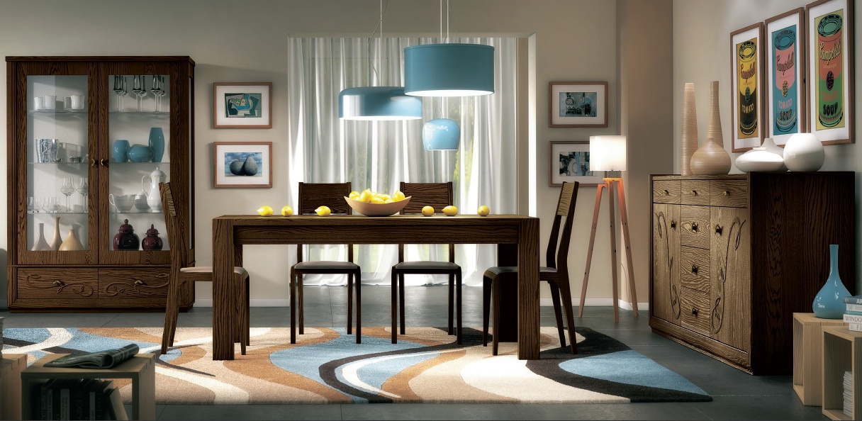 Giselle set: dining from Italian manufacturer Arve Style. The furniture set includes: dining table sofa, chairs, sideboard and showcase. Frame, base made of solid wood. Finish - walnut veneer from porous shade tobacco. The surface is matte, clearly visible wood pattern. Acts lakirovanie decor floral ornament. The headset modern design with classic influences. A great choice for stylish dining room interior. A rich palette of shades.