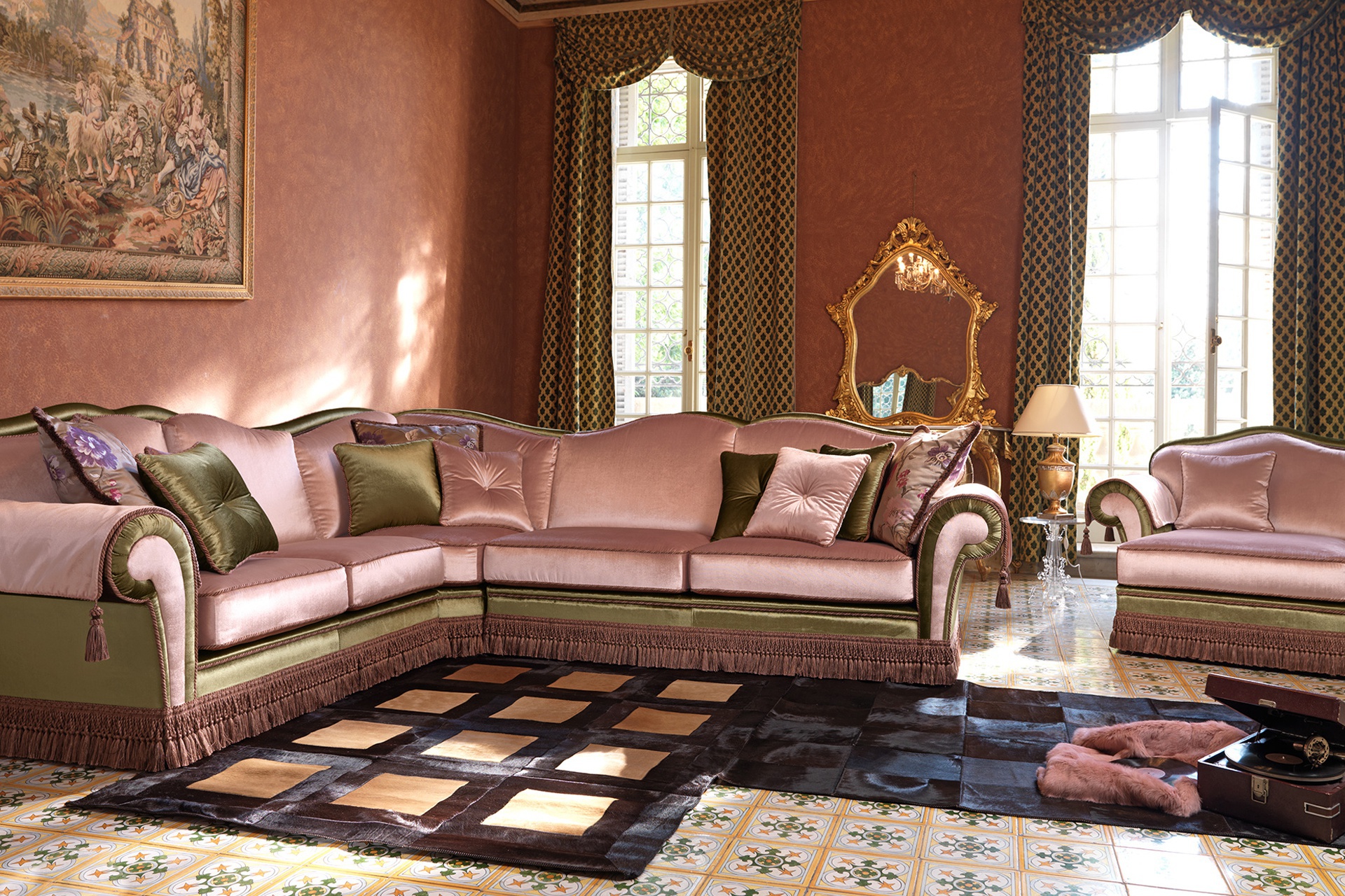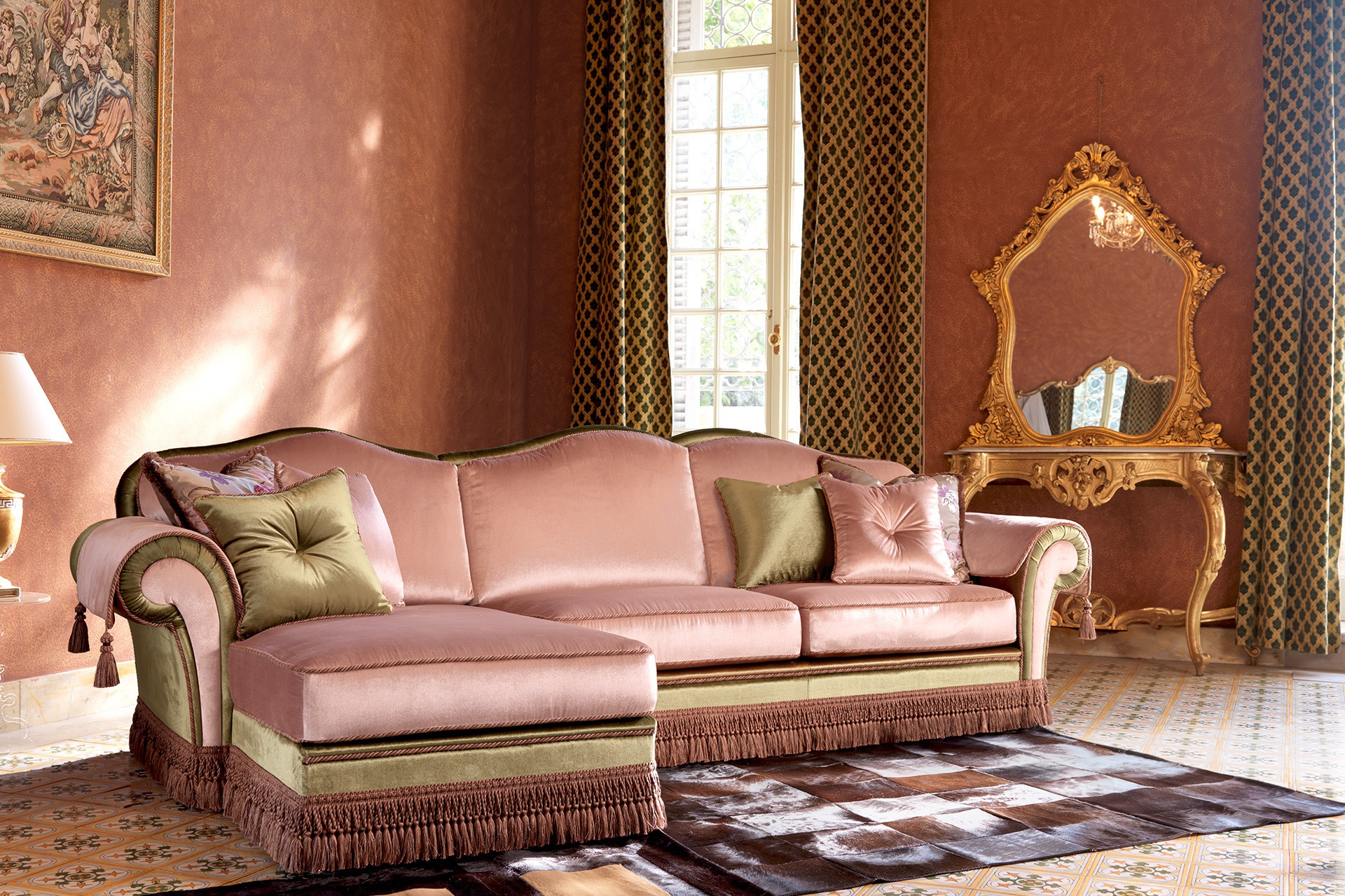 A modular sofa from the collection of Arthur Home from the Italian manufacturer Domingo Salotti. The model luxury in the style - classic, is a three-seat sofa with chaise longue and storage box. Material - composite wood, frame is made of poplar wood and pine. Welded steel mesh in three additions, filler - polyurethane foam of different densities. Mattress height 8 cm covered with a cotton canvas. The back is curly, the bottom of the sofa trimmed in fringe. Also available in spring version and finish the hem. Upholstery - textile plain or printed from the company portfolio. The terrain of the sofa is finished with piping; rolled armrests covered with capes with tassels. Complement a set of decorative pillows. Colors to choose from a collection company.