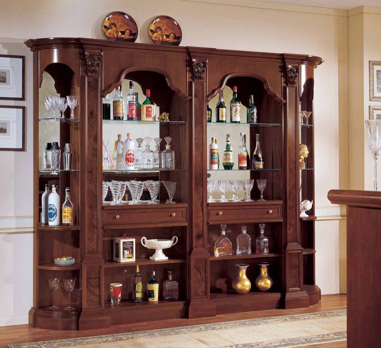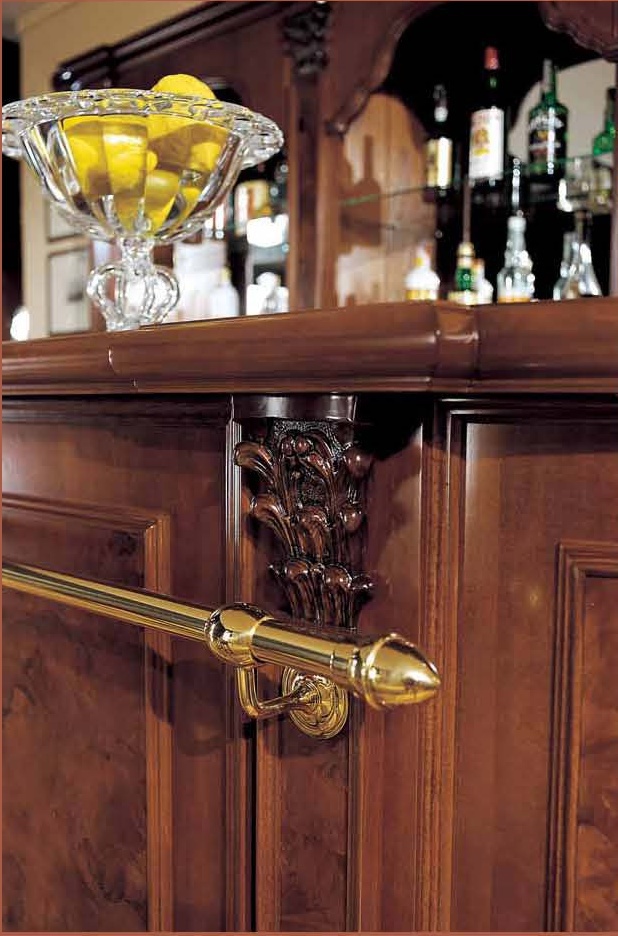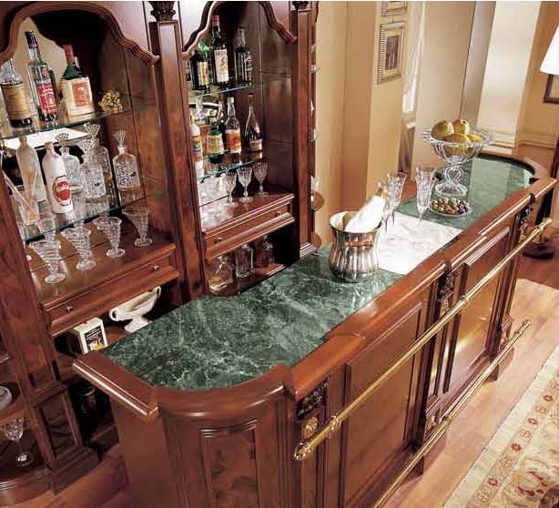 Bar (Suite bar) from the Italian manufacturer Mirandola Export. Bar Cabinet with drawers and mirrored back wall, bar counter with marble top, cupboards and space for fridge and bar chairs with leather upholstery are set from Mirandola Export. The headset frame is made of wood. Elegant products, which are decorated with original carved decor will give Your interior the luxury and comfort.