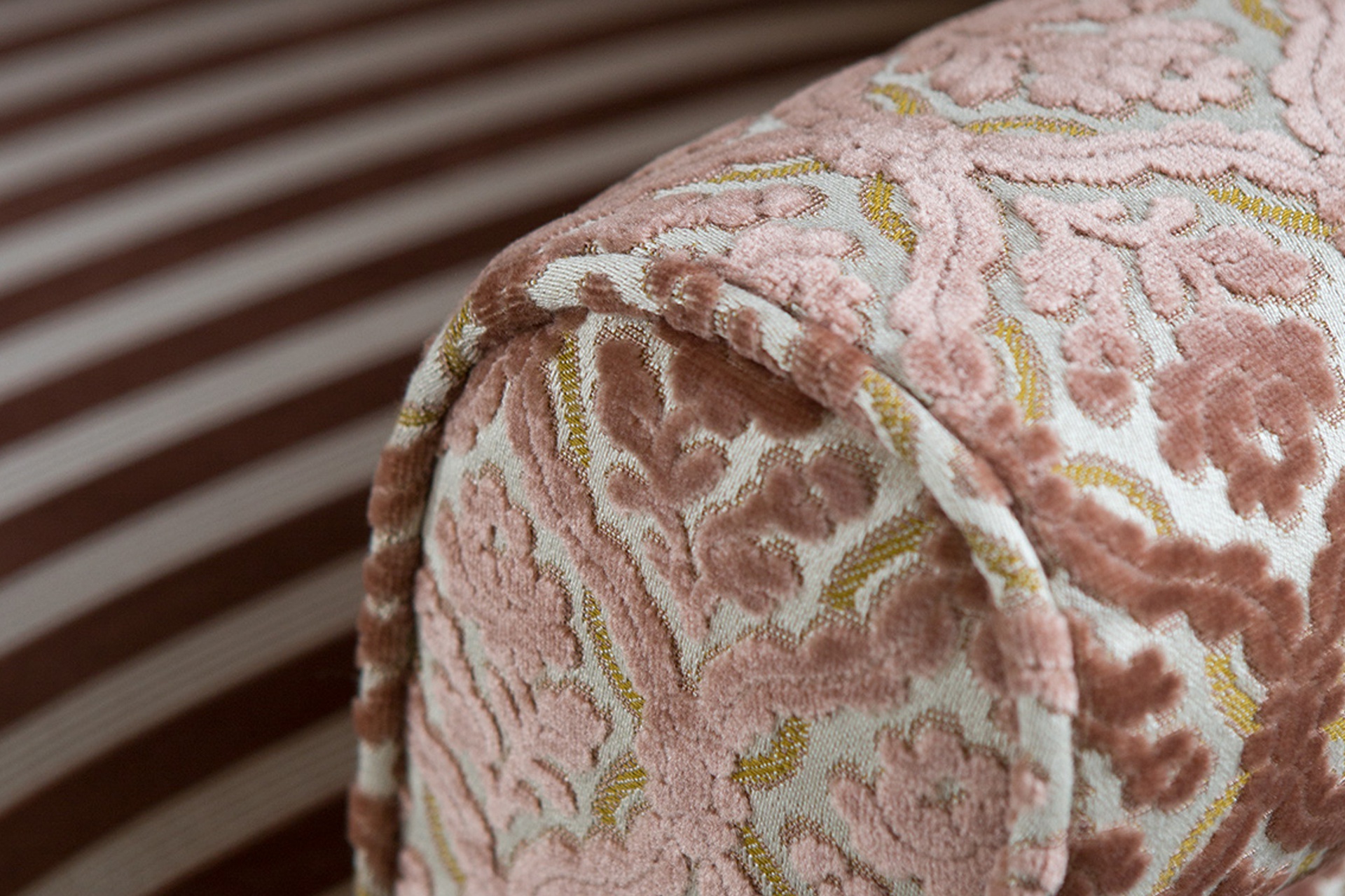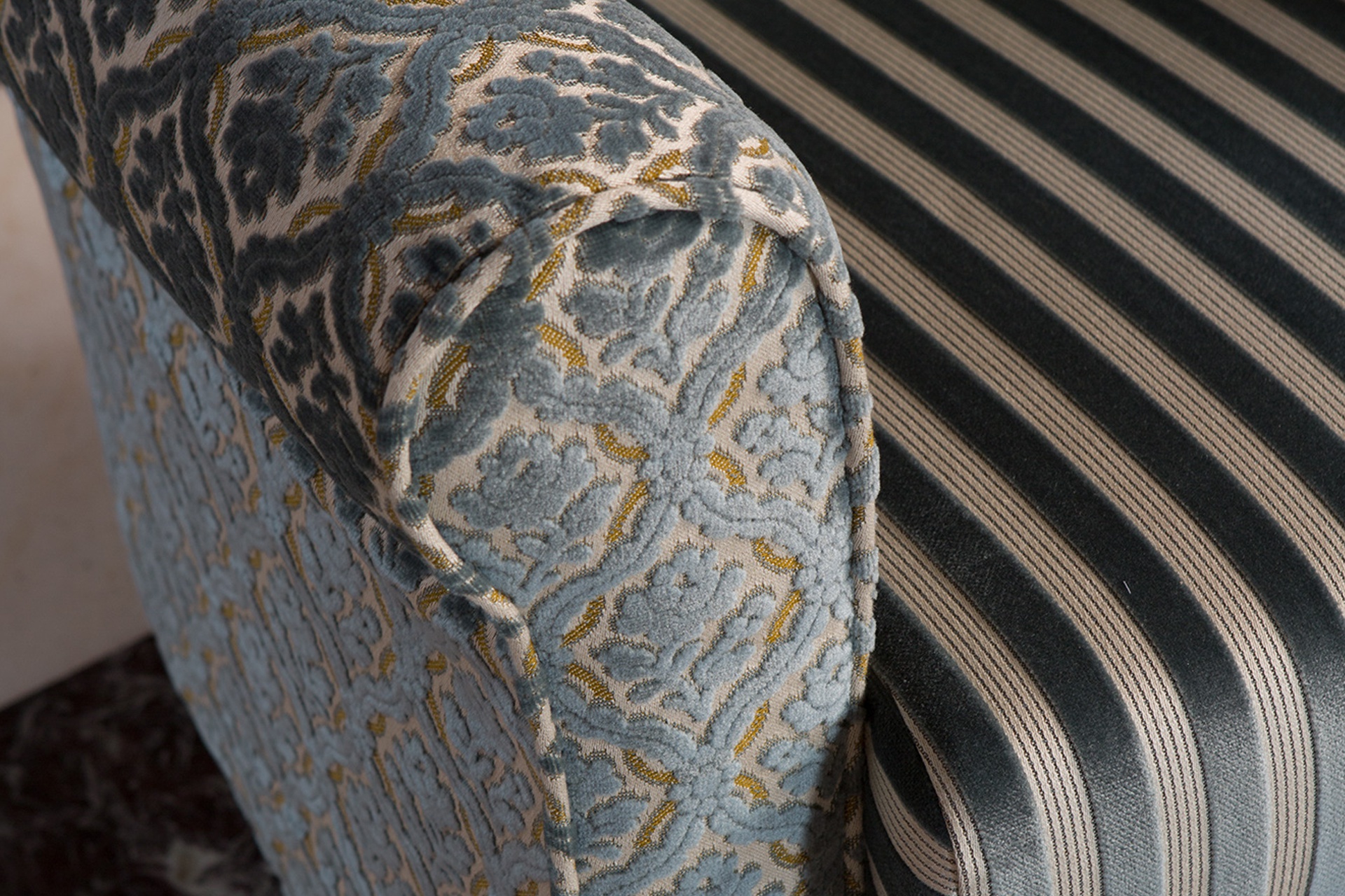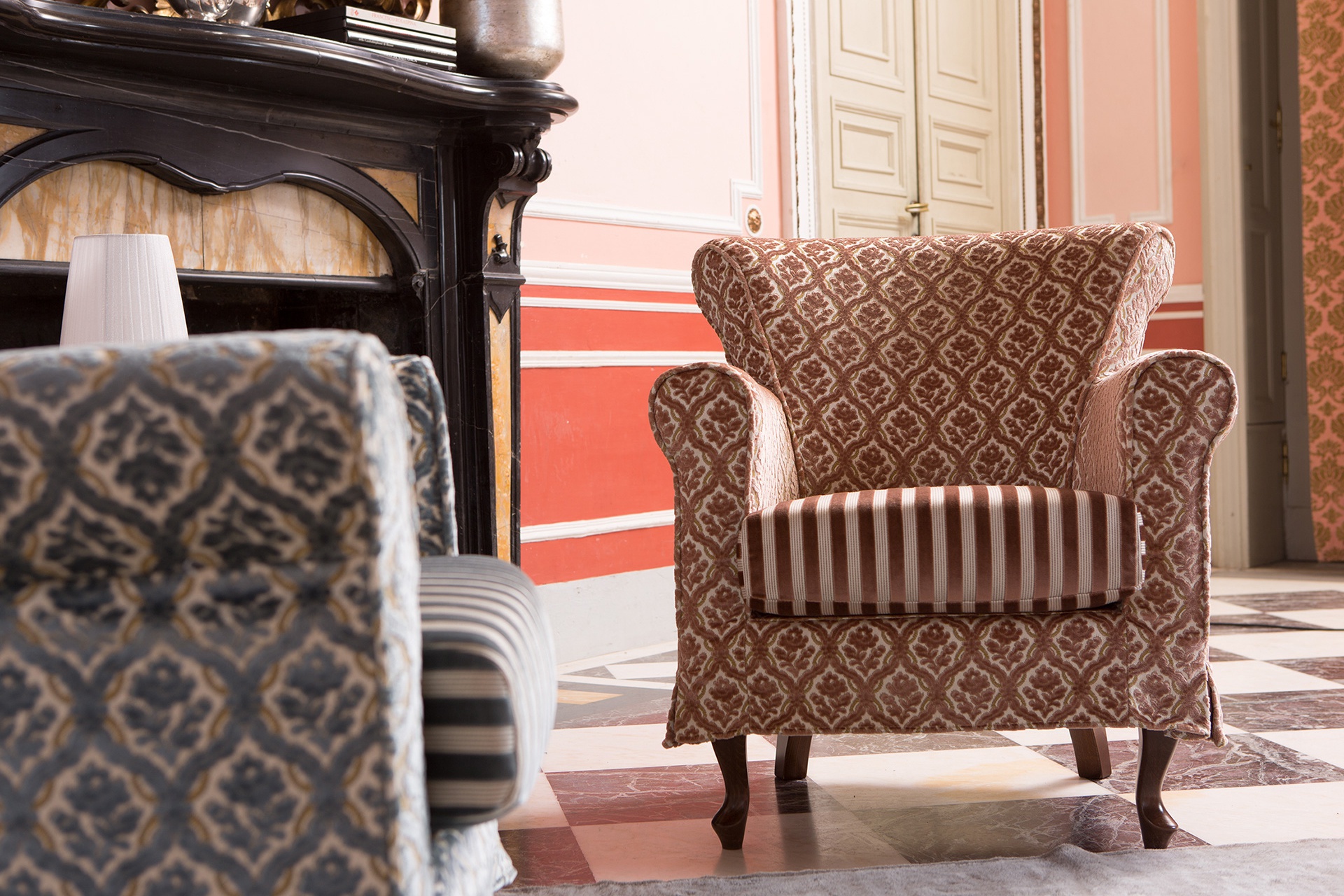 070 chair from the collection Home from the Italian manufacturer Domingo Salotti. Versatile chair with high backrest can be used in almost any room. Carried on the frame of steel pipes, bent wood legs, also available option model on wheels. The high back and seat upholstered in textiles from the company's range, the filler - polyurethane foam of different densities. The back is curly, textile upholstered with flower pattern, striped seat, soft armrests, the legs covered with skirts. The model is available in plain upholstery. Colors to choose from a collection company.